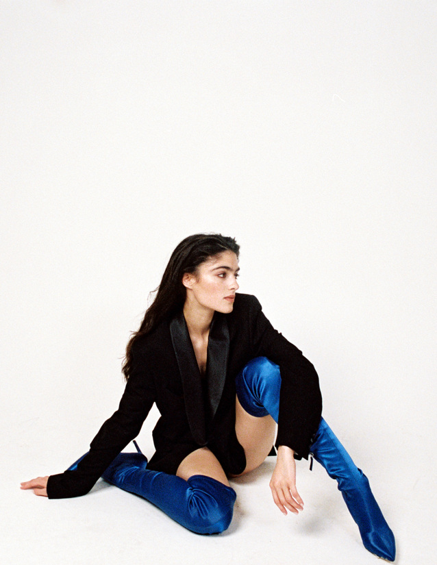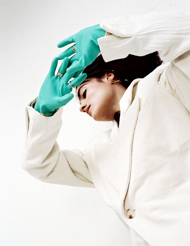 Suit: Lea Nyland Studio Rings: Other Stories + ‘Bleeding signet’ by Connor Joseph Necklaces: Stylists own Earrings: Other Stories Shoes: XY London Gloves: Domestic Latex Gloves