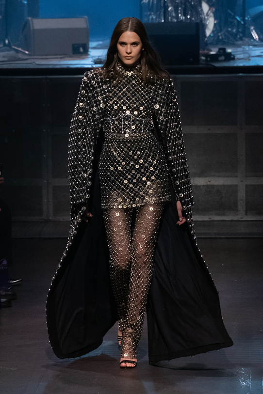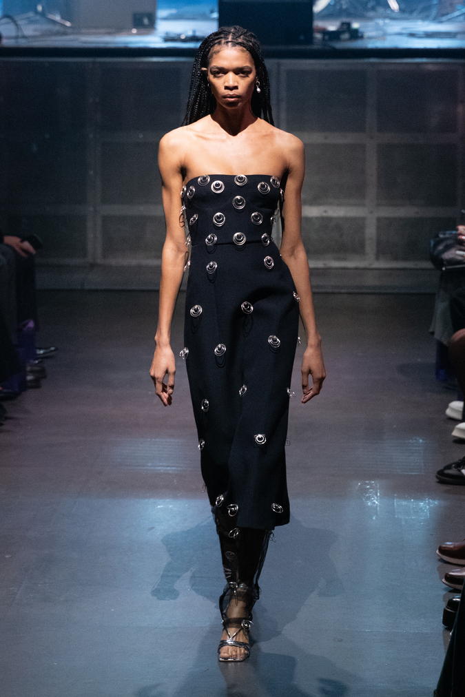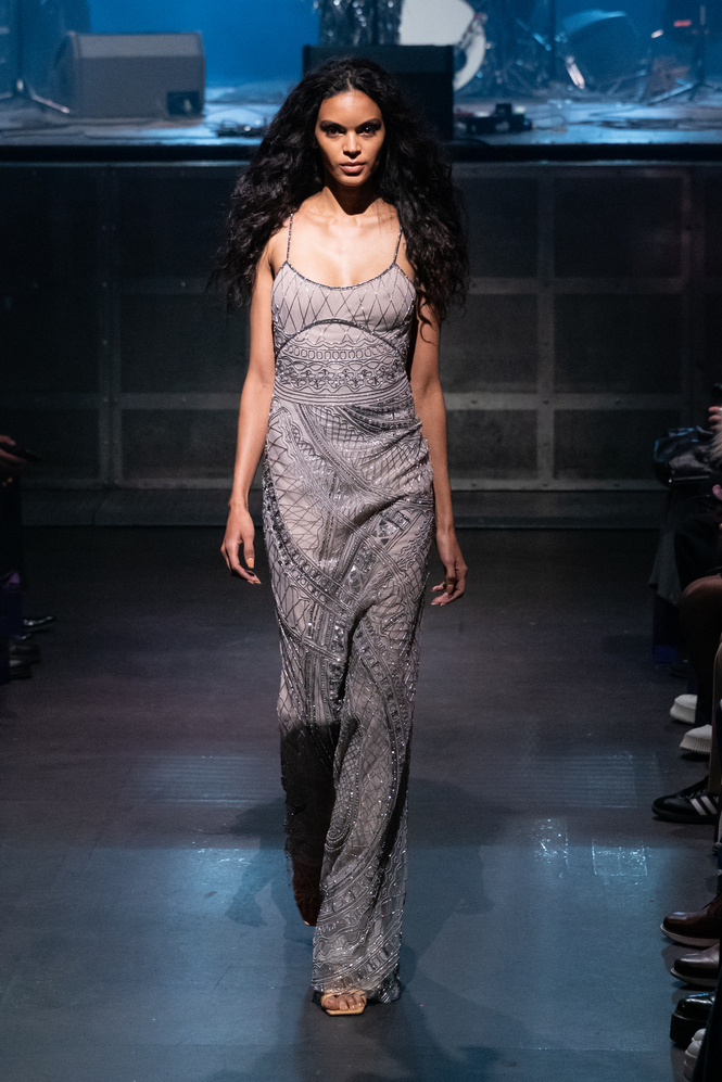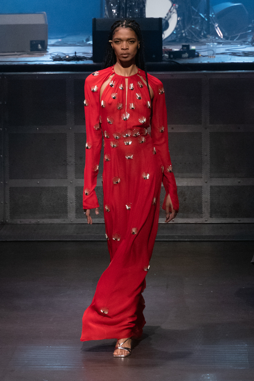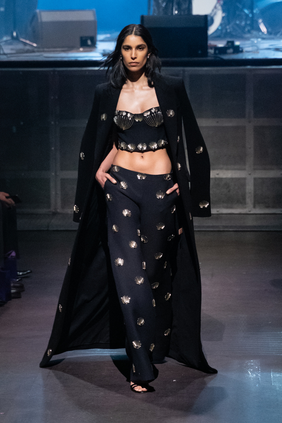Their second runway show (first CFDA calendar official) for FW23 saw the brand go to a different level of production & presentation. The historic live music venue of Webster Hall was the site selected for the runway show, setting the stage for an edgier show with a lot more energy. The band Breanna Barbara performed onstage during the runway show, withlead singer performing in a Cuculelli Shaheen black set with long silver beaded fringe. Models strode through the seated audience in floor length looks from dresses, to trouser/top sets, and dramatic overcoats.