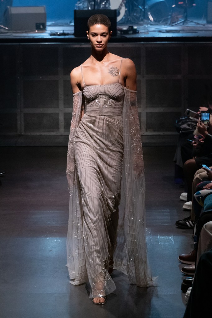 Design duo Anna Rose Shaheen and Anthony Cucculelli are relatively new on the NYFW scene even having fourteen collections to their name & their designs frequently selected for celebrity red carpet appearances. Their first runway show took place last season, for SS23 in the Bowery Hotel. Summery colors of serpent green, and ombre purple as well as their signature look of intricate detail, masterful beading & tailoring and sexy sheer evening wear were beautifully presented. Models strode down the runway where the garments not only engaged the senses visually, but the sound of the beading was noticeably present. The weight and quality of the detailing allowed for guests to hear the garment/model in some cases, before they saw her, adding a richness to the eveningwear.