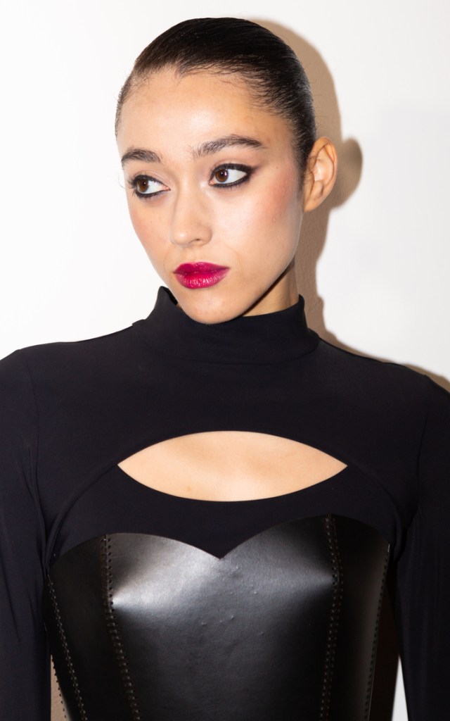 The looks for FW23 balanced structure with edge. Suiting would be paired with long leather gloves. Velvet, leather, and sheer material were all leveraged to take classic elements of fall and winter fashion to a new and modern level. The most extraordinary look was modeled by Coco Rocha mid-show, a (faux) leather corset top, coupled with a maxi skirt with a high slit and a train. The designer confirmed that the skirt was jersey, yet it looked like water.