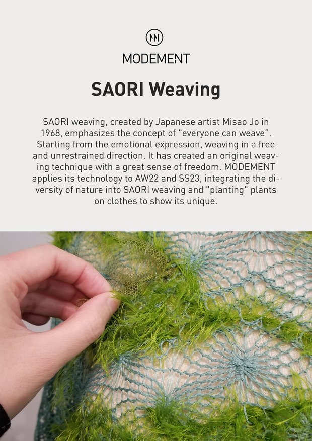 MODEMENT Fall/Winter 2023 takes “a breath of fresh” as the point, using upcycled fabrics through traditional embroidery methods, reproduced the shapes and textures of plants such as moss and cherry blossoms, “planted materials on different clothes to represent the “freshness” and “growing”. In order to create a concept that seems fragile but extremely powerful. The classic series are all based on the design of “zero-waste” focusing on simple lines and neutral style, interpreting the meaning of being freedom” by using its signature natural materials, including silk, or-ganza, linen and cotton. Alongside this, it has used leftover materials to create its signature woven lace while pioneering new techniques for upcycling and zero-consumption, restoring fabrics to rebirth. Enhance the brand’s handmade tradition and sustainable philosophy.