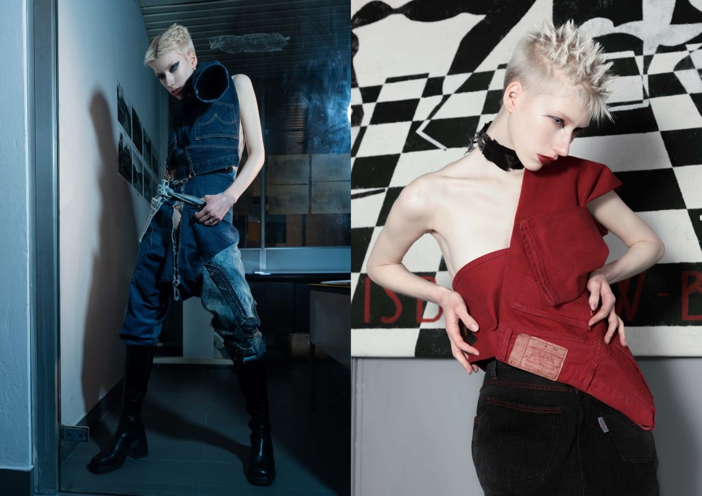 This project was created to portray a different vision of the denim. The classical use of clothes is gone. It is replaced by a stylistic approach based on mid-70s punk culture. Skirts and pants are used out of its own typical function and reflect a ready-made feeling.