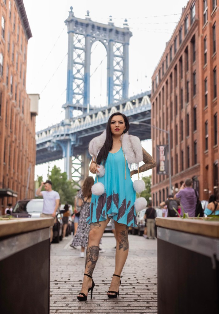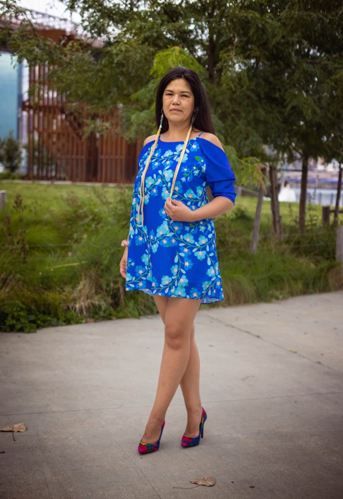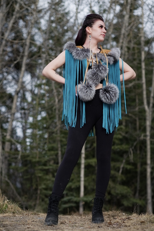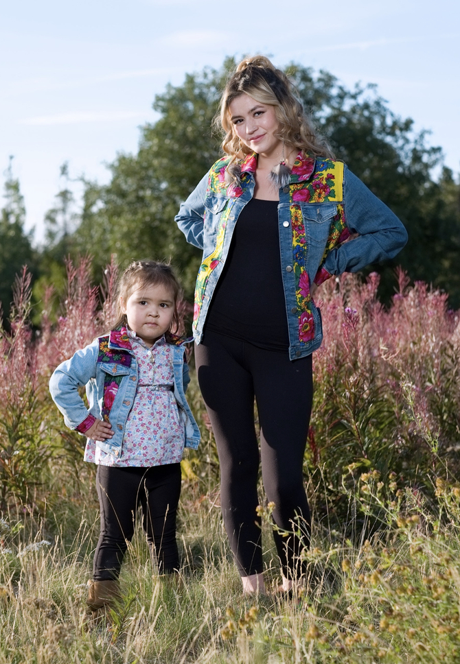 The fashion designer Natasha Peter is a single mother to a beautiful 4 year old baby girl who is proudly teaching her Dena ways. She is from Ross River, Yukon Canada and she is from Kaska First Nation.