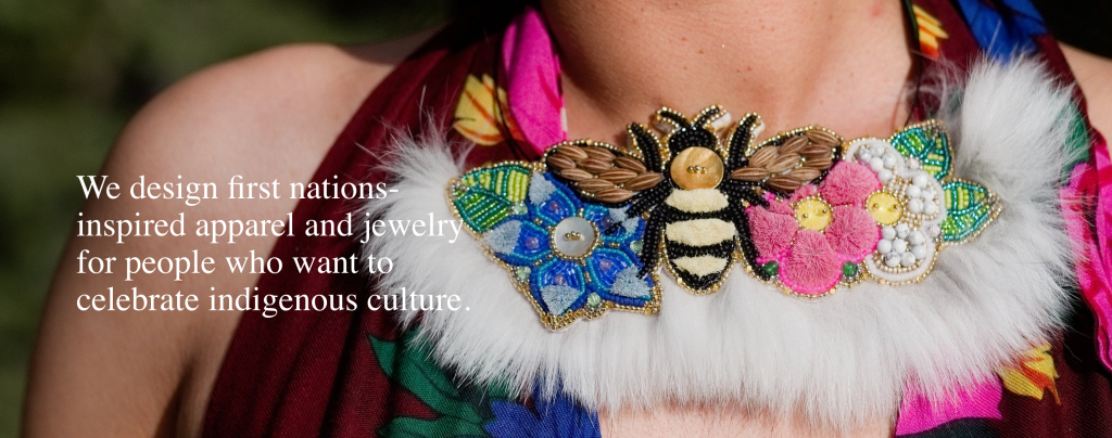 ”When I create, it comes from the place of honouring those that have taught me what I know to be true. The land heals us, nourishes us, inspires us; it is our home. To be inspired by the environment is to see the natural beauty it offers us and reflect its warmth, colours, and peace for us to appreciate once more. When I create, it comes from the heart. A place of calmness, creativity, and love for my culture. The strength and fighting spirit of my grandparents are what gives my work its unique beauty. As I sew, memories of those I love are stitched in every piece I make. When they wear the clothing I make, my customers feel the confidence, pride, and beauty my grandparents have taught. This is what makes my clothes so unique. When I create, it is not only about me. It is also about providing a legacy that appreciates, and protects the traditions that have defined me and my ancestors. In celebrating my culture, I can pass it down to future generations. When my customers wear my designs, they support me as an independent artist. This means providing for my daughter and myself. In being independent, I can do what I love!”