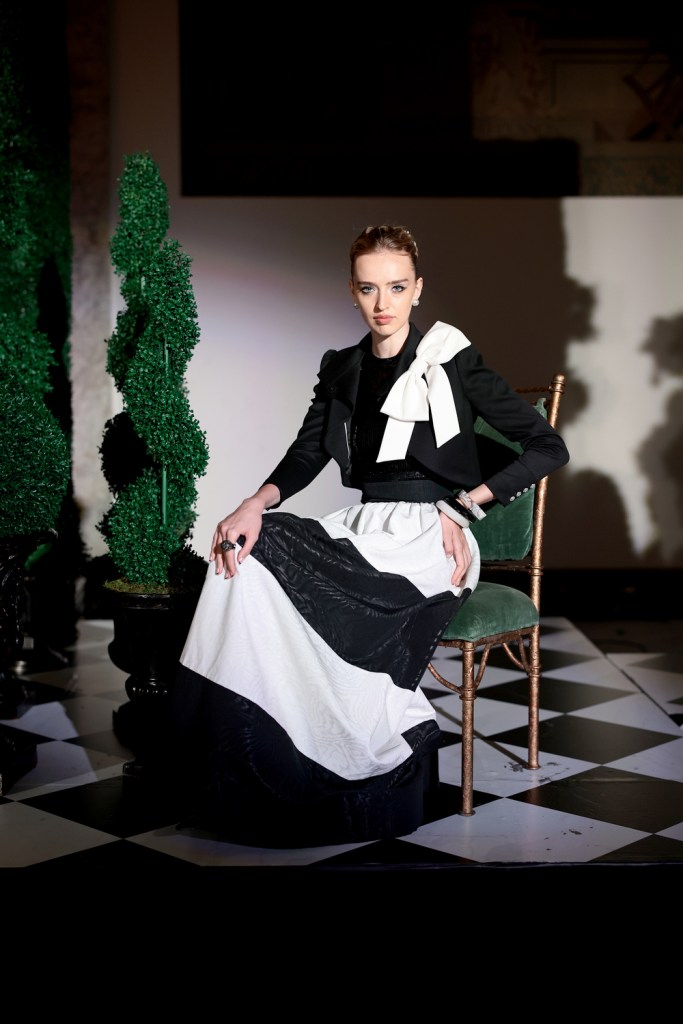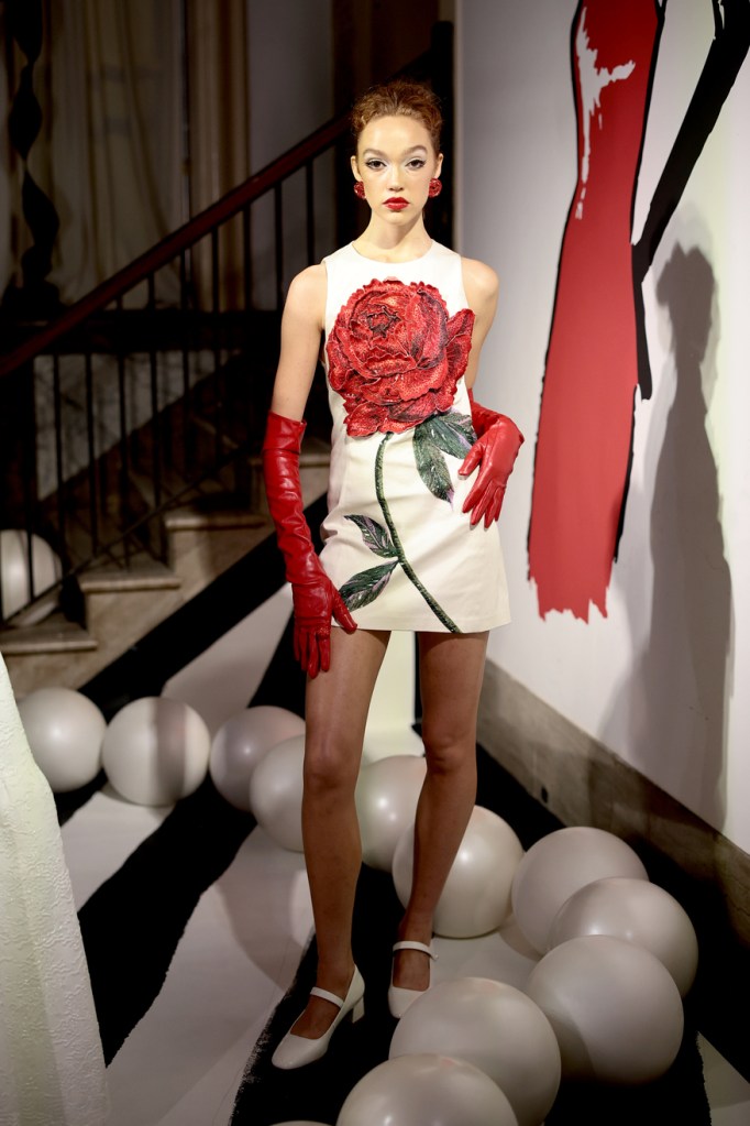 The Spring 2024 “Black and White Ball” presentation of Alice + Olivia by Stacey Bendet brought the playfulness to New York Fashion Week this season with fresh floral motifs in print and applique, monochromatic looks from red to lime, and themes of movement within design. The collection debuted on September 9, 2023 at four o’clock in the evening in a vaulted ballroom with classical art lining the walls and a whimsically larger-than-life set design filled with lively music and fanciful design. The brand drew inspiration from Capote’s Swans and high-society of the 1960s, presenting a renewed vision of the historic time period, and featuring a live DJ set by Nikki Kynard. One can clearly tell that designer Stacey Bendet had a lot of fun playing with proportions and silhouettes in new fabrics this season that spoke to the brand identity of wearable playfulness while bringing a breath of fresh air. The models were chatting amongst themselves with cheeky smiles, and looked like they were having as much fun themselves as the designer was having with their assorted designs. Their slick hairstyles put focus directly on the garments’ sense of playfulness, and recurring crop silhouettes conveyed appropriate youthfulness at any age. The show’s invitation for guests proudly encouraged attendees to “be your own work of art” in painted strokes, and this same spirit of freedom echoed within each presented look.