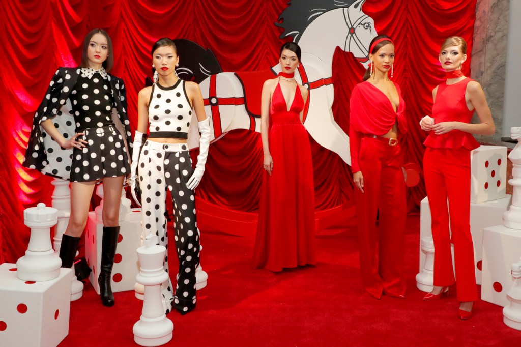 Both the new garments and inspired cocktail drinks were flowing as guests of the presentation mingled cheerfully through the staged collection, set in monochromatic sections amongst giant toadstools, a larger-than-life tea set, and painted thematic backdrops that made for an absolutely stunning set design. The looks were majorly airy or cropped, keeping with a theme of allowing for movement within design – from floor-length gowns to sleek pale denim, the collection held an appropriate outfit for any level of sophisticated event at any age, which is no small feat!