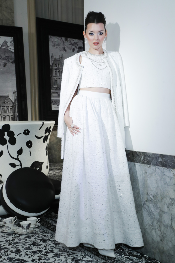 Style standouts in the collection were plenty, due to its hugely versatile offering of looks for any event. One of its most eye-catching facets were this season’s signature textiles – for example, an elegant woven leather textile, most notably shaped into an uber-cool short and bomber jacket combination and styled with mod go-go boots to the knee. This woven leather texture featured in both bright and dark tones in a range of designs, styled with notable thick stacked bangles and an open front top that added edge to a long bell-bottom flared pocketed pant. Floral motifs were fresh as well, manifesting in a large trompe l’oeil bloom pattern done in oil paints of red and blue, instead of the more conventional watercolor florals we’ve seen brands use in recent seasons. Shimmering tweed in metallic crisp white also stood out, especially when formed into a long crystal-bordered blazer, tiny crop top, and sweeping maxi-length A-line skirt three piece set.