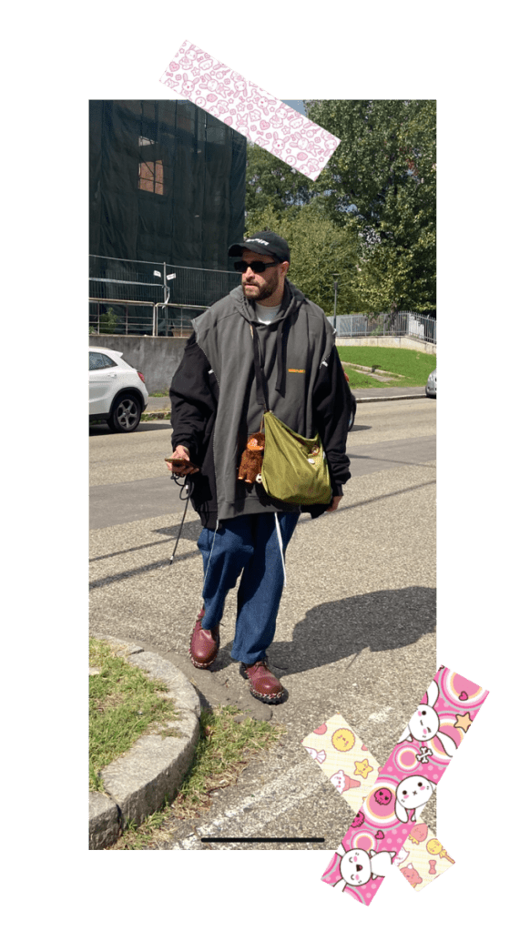 Io arrivo dopo due metro, un tram, un bus e un pezzo a piedi che mi fa sudare come un maiale perché ho scarpe troppo pesanti e dure quando mi ritrovo per scioperi o traffico a camminare per forza. Per poi arrivare nel peggiore degli stati davanti ai fotografi un po’ violenti che mi immortalano lucido in faccia nella peggiore smorfia del disagio o chiedono di spostarmi perché sono in mezzo alla foto di una importante creatrice di contenuti Lituana che sarà in prima fila da Gucci Again.
