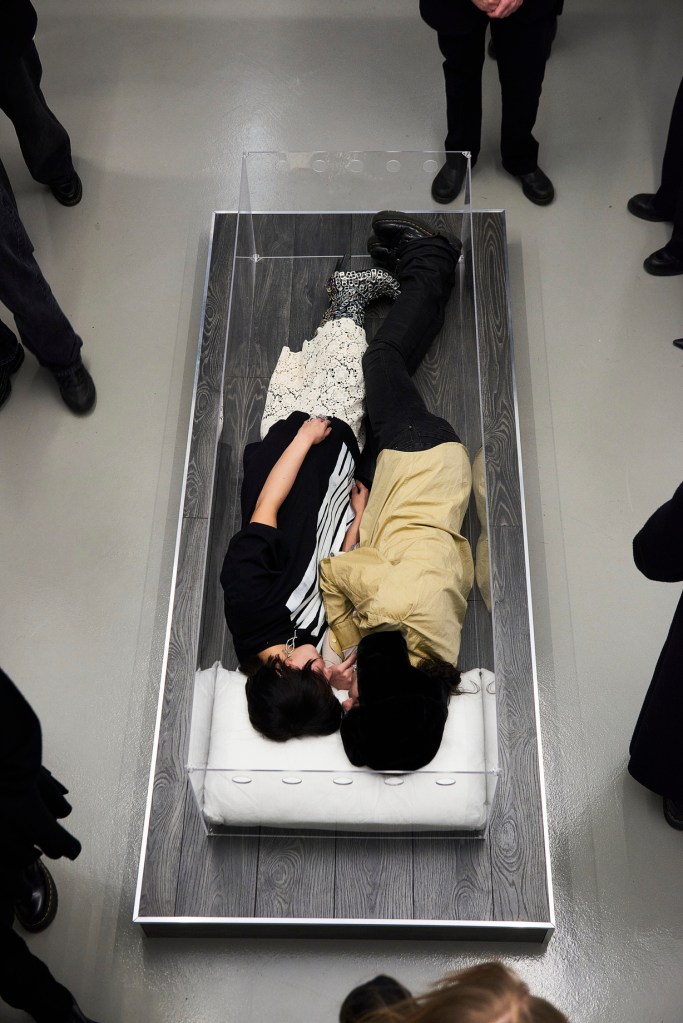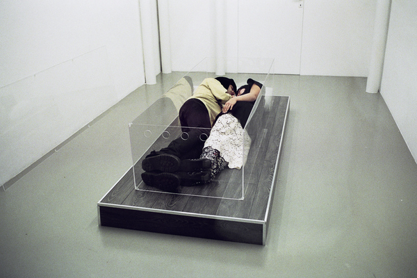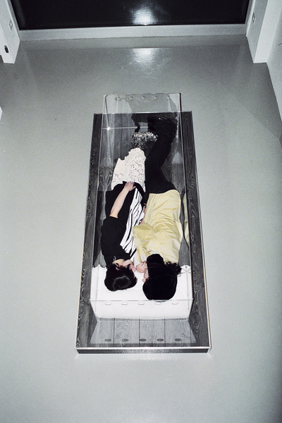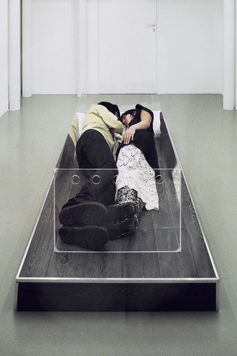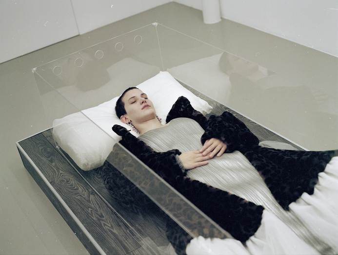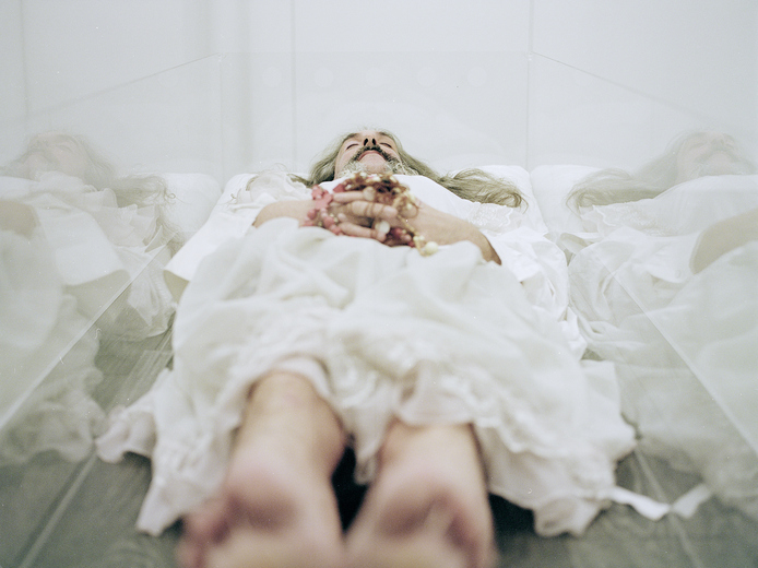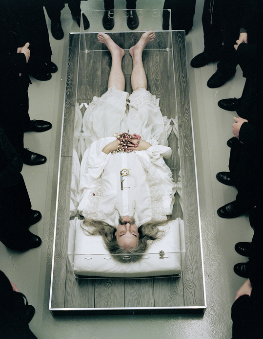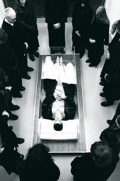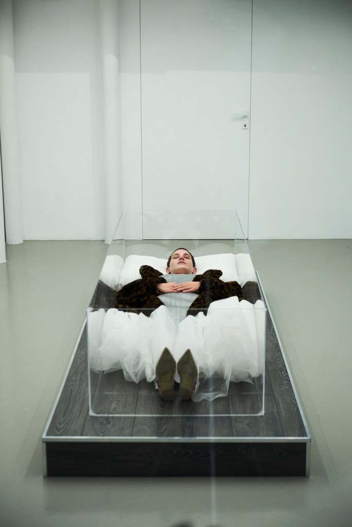 Sensibility is the key word to describe Life in Death. I had a 2m long casket built because I found a transparent, safe, delicate environment elegant and interesting, rather than a dark, impenetrable, heavy wooden coffin.