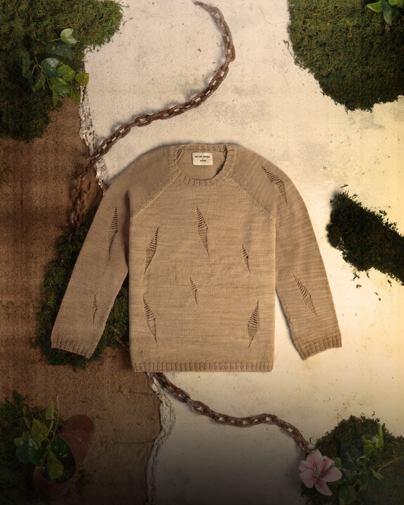 The collection highlights techniques such as distressed aesthetics, raw edges, deliberate cuts, and hand-knitted items like the V-Neck Knitted Polo and Distressed Knitted Sweatshirt. How do these techniques not only showcase craftsmanship but also align with the dystopian theme of the collection?