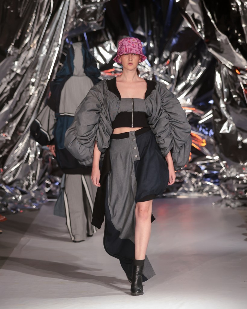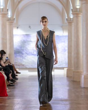 The project on the theme of surrealism demonstrates unity and cohesion through the choice of fabric, specifically the light gray cotton. Each individual outfit conveys the designer’s personal interpretation and inspirations on the theme, but when brought together as a unified collection, they complement each other and present a variety of techniques and textures that work together, thanks to the monochromatic palette.