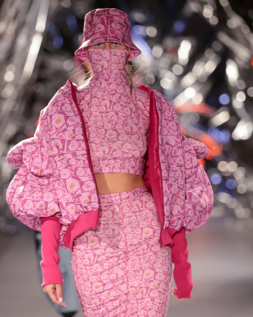 Bouquet Bandit is a collection inspired by a real story and a pseudonym of the controversial character of a bank robber, who wears the typical “gang” vibe and his transformation into a romantic flower lover.The bomber jacket and baggy jeans are street style classics as well as hoodies, hanging tees and sleeves, that express the ghetto aesthetic and culture. Slightly sneaks the idea of being dressed for success with some business clothing details. The palette of dark shades categorizes the negative image and the sense of mystery and danger. The flower symbolism in the structure of the silhouettes hints delicately until the pink triumphs to destroy the established rules and to give a whole new perspective of a gangster romance. The dynamic unfolds in mania for banknotes “threatened with extinction” in the digital future. I made my own special design of the dollar based on the story character and I turned it into original printed fabric design that presents the money cult in a positive way.The collection traces the metamorphosis of the dollar from its cotton textile nature – the denim fabric lasting over time and trends – to a commercial product for the consumer society that always expects something new.