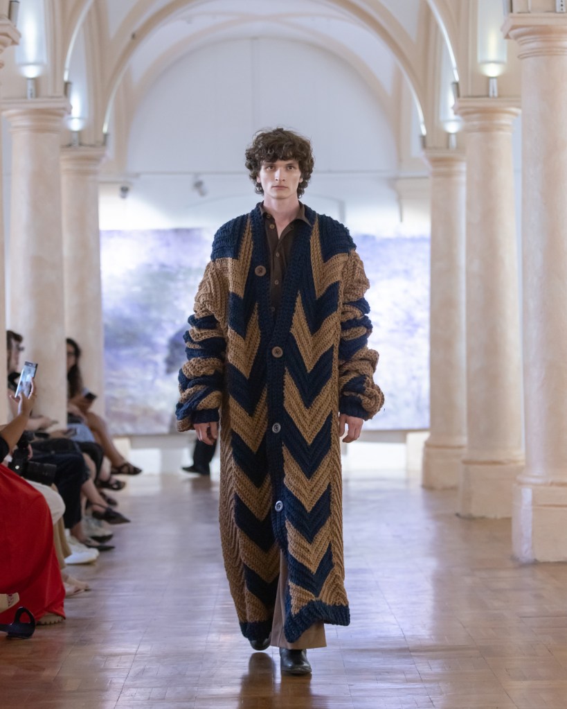 This collection is dedicated to the designer’s grandfather and their moments together that he cherished. The collection is heavily inspired by the seashore and life on the coast. Vicko was surrounded by the fisherman’s equipment and work attire entire childhood and those elements took a big part in designing clothes for this collection. Designer was using a lot of natural cotton materials which are combined with heavy hardwear and embellished with metal parts. For the first time, Vicko is designing knitwear because that was the main connection with clothes that his grandfather used to wear. Knitwear was important because of the tactile element which is connecting feelings to memory. In the last two years, the designer learned how to crochet and later he used that technique as a main part of the collection. For example, a long crocheted vest/coat with the arrow pattern took 4 months to make while a crochet granny square jumper was made out of 84 different pieces. Most of the materials are natural cotton while in knitwear, used yarn is a blend of wool and acrylic threads. All in all, the clothes radiate with a strong symbolic black and brown palette with different textures and materials while the whole collection [grand]-PA is rich in story, childhood memories and associations on the loving person from his life.