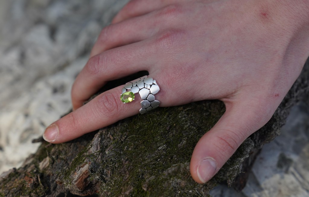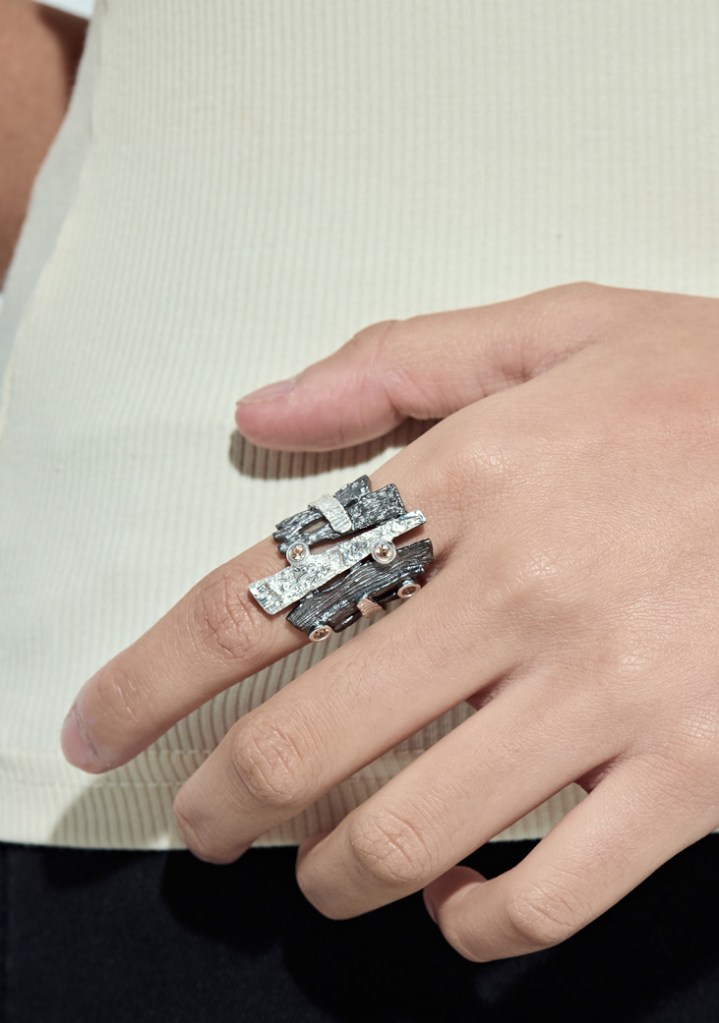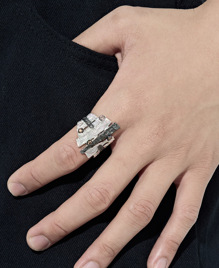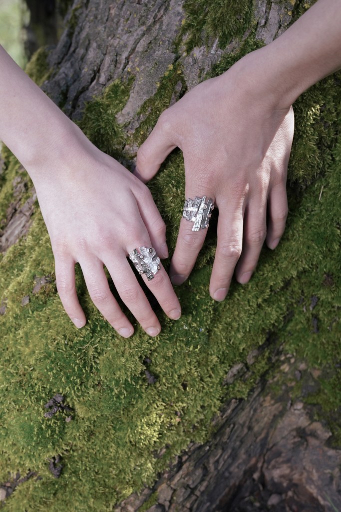 Nature is full of amazing and natural asymmetries and symmetries, often hidden in the details. Examples include the hexagonal patterns of snowflakes, the structure of beehives, the stable arrangement of branches in bird nests, the distribution of tree bark, and the way tree trunks taper and extend. These elements are both irregular and regular at the same time. I have developed a habit of capturing these details, which sometimes manifest as textures, structures, arrangements, or unique combinations. I focus on the aspects that attract me the most and find ways to present them in my jewelry designs.