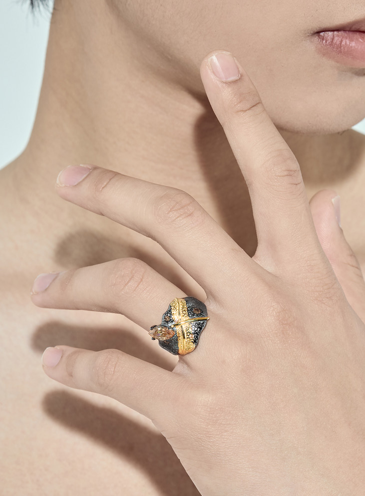 The design of the ring takes the form of a bird’s nest, but its shape is reminiscent of the female anatomy. The black color represents the pain of childbirth and the suffering associated with menstruation, while the white symbolizes purity and self-essence. Women, beyond being mothers or fulfilling other roles, should embrace their true selves—pure, beautiful, radiant, and spirited (the word “spirited” here conveys a quality beyond mere age, though I am still seeking a better term to fully capture this essence). This signifies the importance of not being defined by others.