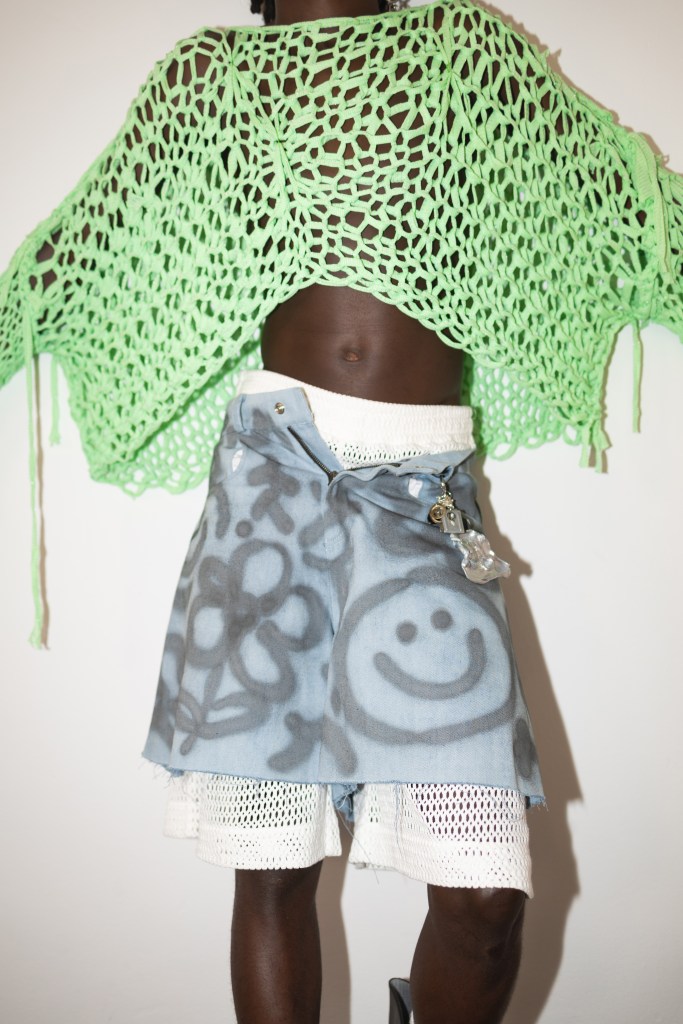 Central to You’re Mean is BÉHEN’s innovative approach to textile manipulation combined with a responsible ethos of upcycling. Utilizing natural fibers such as cotton and linen, the brand emphasizes both sustainability and craftsmanship—the latter reinforced by the intimate work done within their Lisbon studio, where much of the embroidery and design takes shape.