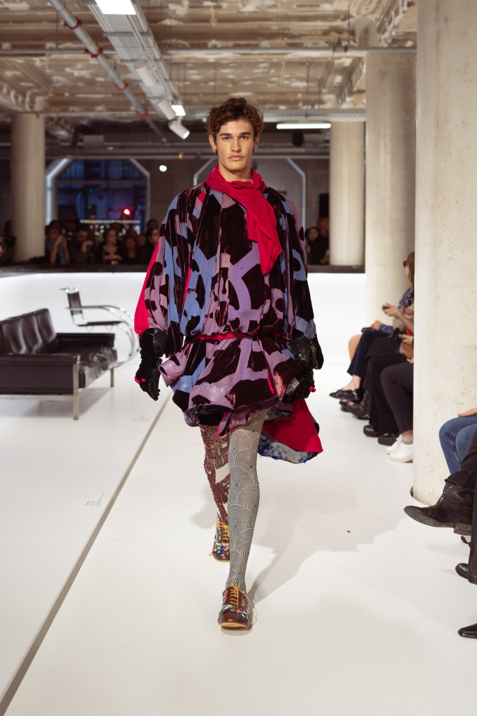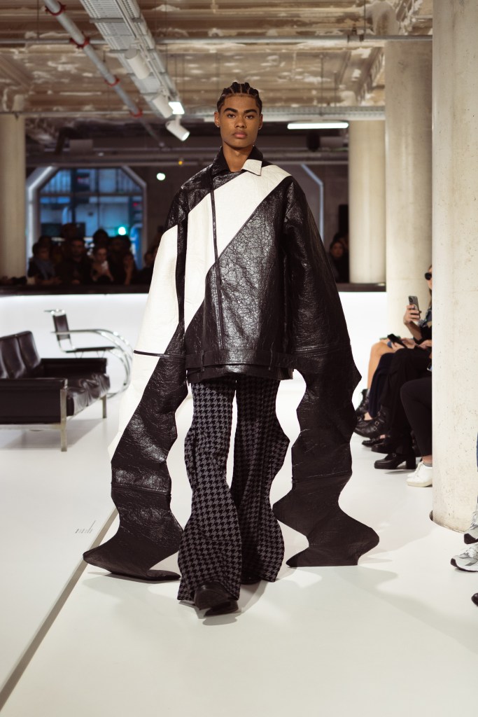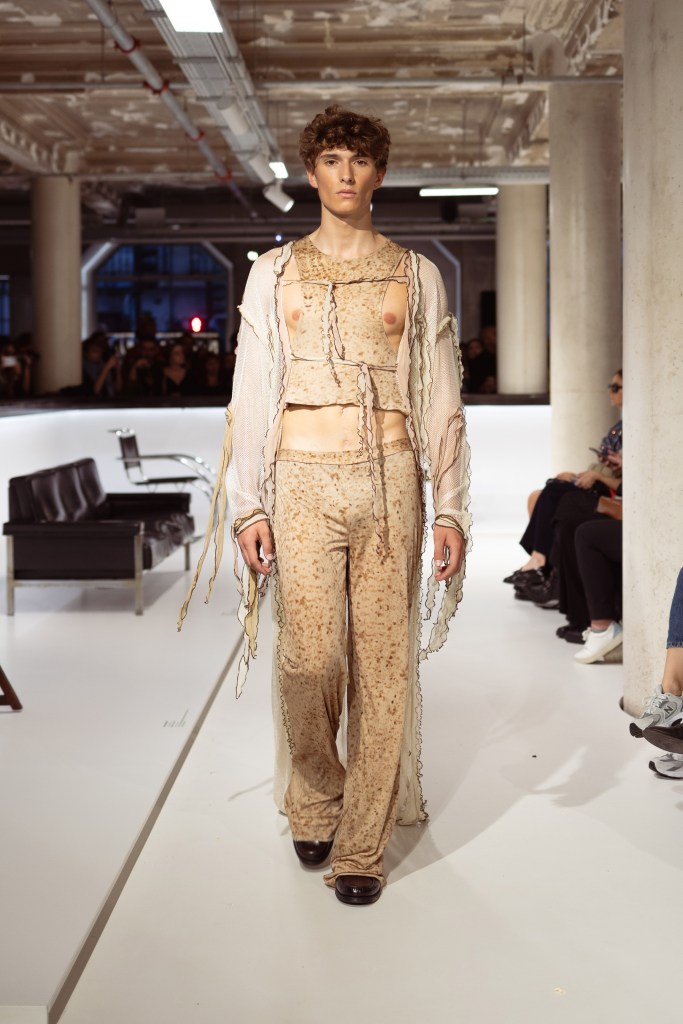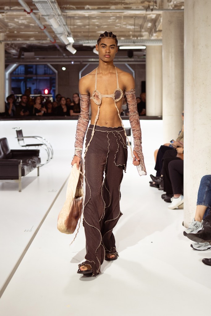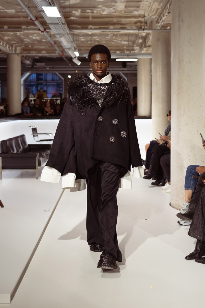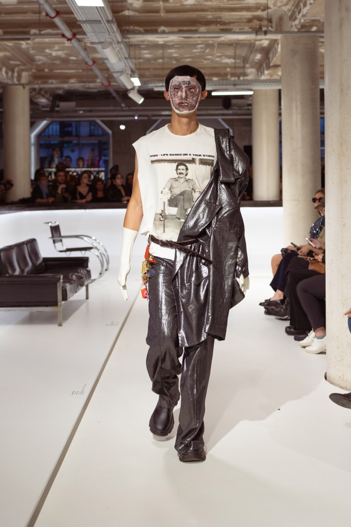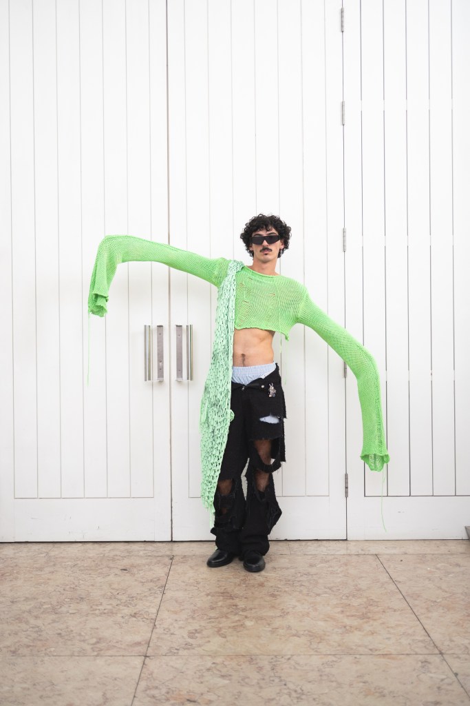 Gabriel Silva Barros, a Madeira Island native and graduate of Central Saint Martins and the University of Westminster, blends eclectic influences to create dynamic, unconventional silhouettes. With experience at Palmer//Harding and Vivienne Westwood, he aims to challenge gender norms and promote inclusivity in menswear.