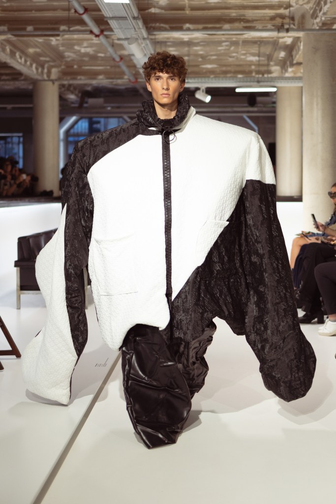 Duarte Vaz Jorge, a promising fashion designer from Lisbon, harnesses his artistic curiosity through his education at António Arroio Art School and the Escola Superior de Artes Aplicadas (ESART), where he is currently pursuing a Master’s in Fashion and Textile Design. His work merges bold, sustainable aesthetics with a striking black-and-white color palette.