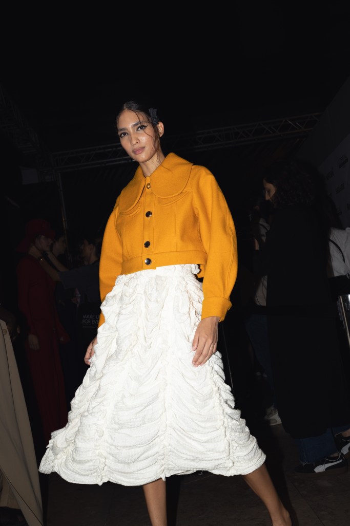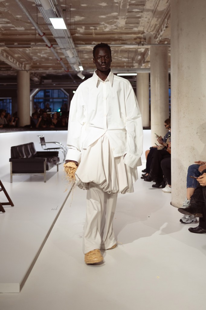 His collection “Paper Models” embodies a return to basics, drawing inspiration from Louis Khan’s architectural principles in both shape and color. It transforms the concept of architectural models into playful origami-like garments, resembling paper sculptures and puzzles. By focusing on innovative pattern-making techniques, Gonçalo aims to rethink design processes as a means to reduce textile waste while blending a conceptual approach with playful creativity.
