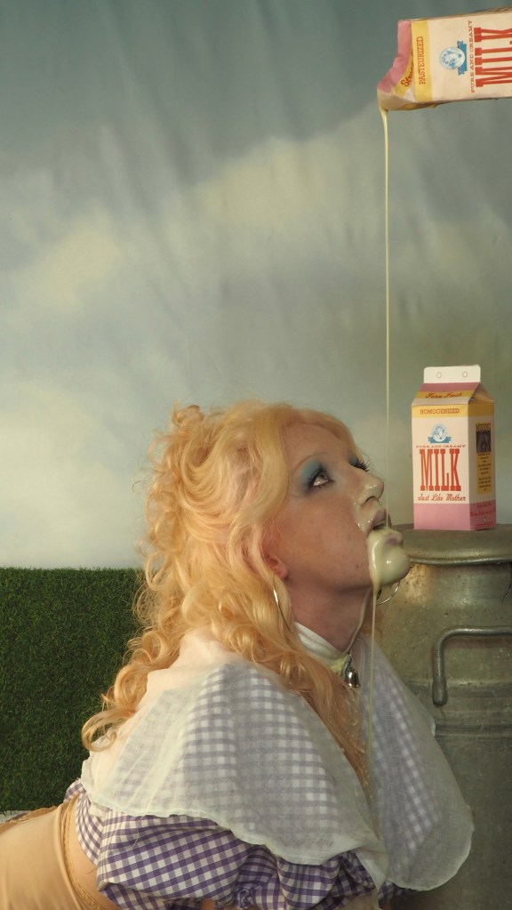 GOTBIGMILK is built on the exploration of the masculinization of the meat industry, objectification of women, animal products and the absurdist of its marketing.