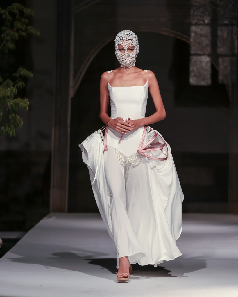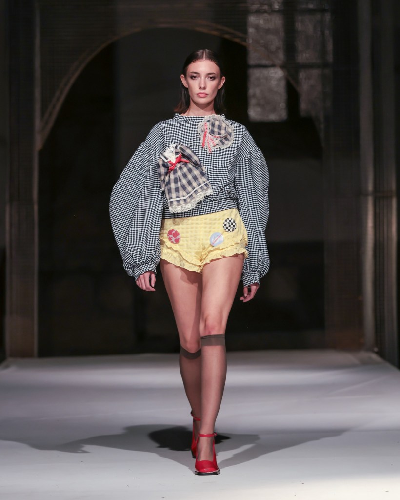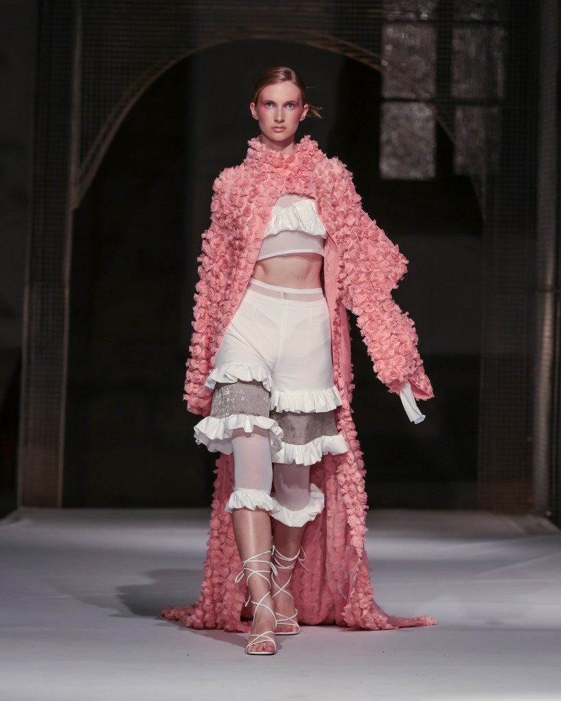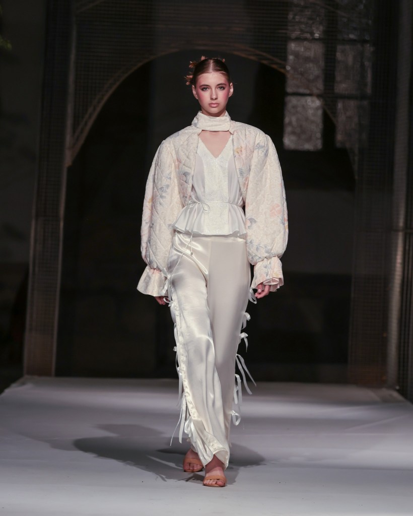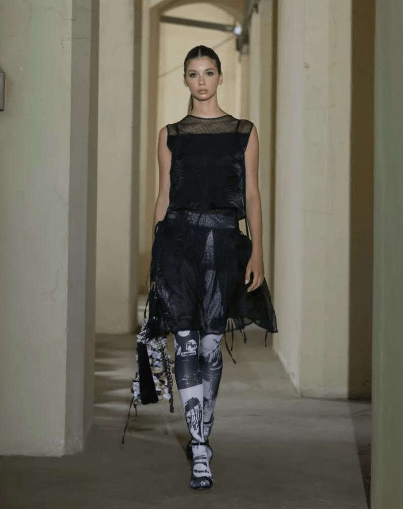 As the sun ascended, the first showcasing took place in the basement of Morii Boromir, featuring Natalie Soto’s enchanting collection, “Paper Dolls”. A meditation on healing and reinvention, Soto transformed fragments of memory into romantic silhouettes infused with an edgy flair. The collection featured reimagined shirts, cargo pants, bubble skirts, and babydoll dresses in a captivating palette of black, pink, and yellow. Employing repurposed textiles such as jersey, lace, organza, and hand-woven fabrics, each piece was adorned with hand-stitched details, pearls, bows, and woven bags—demonstrating that beauty can indeed emerge from remnants of the past.