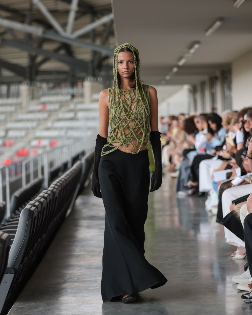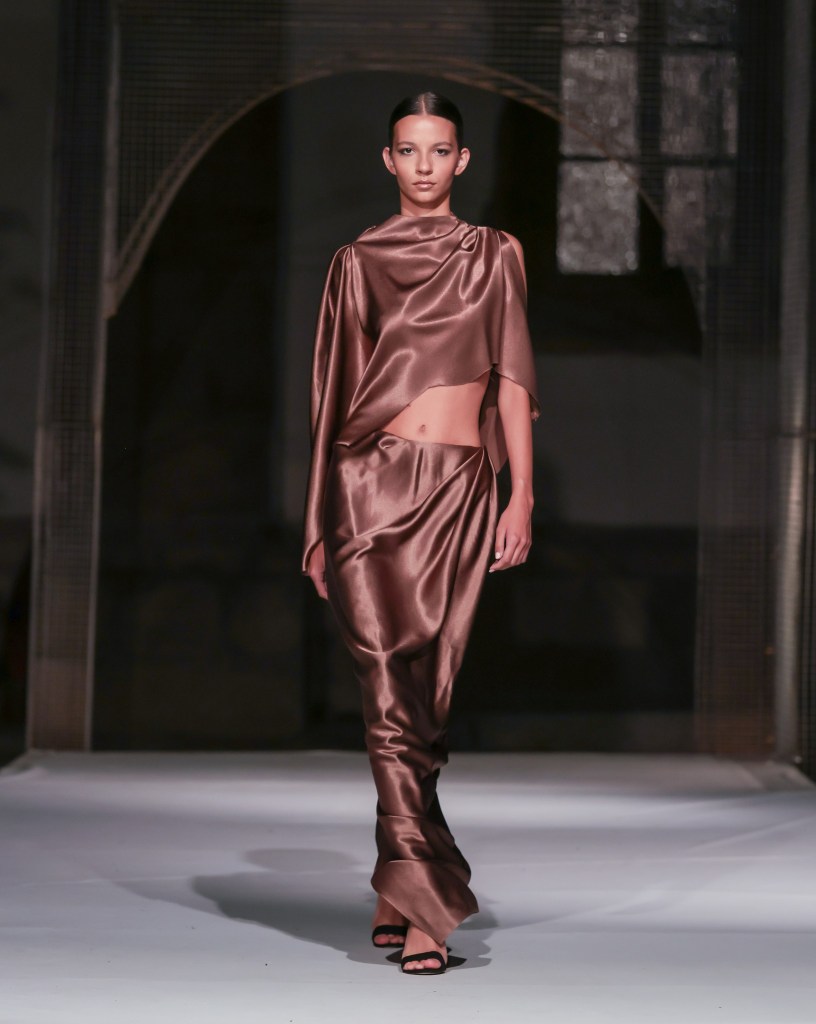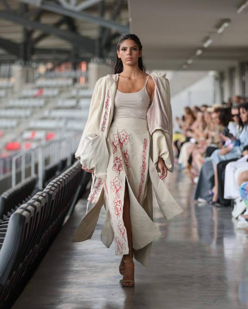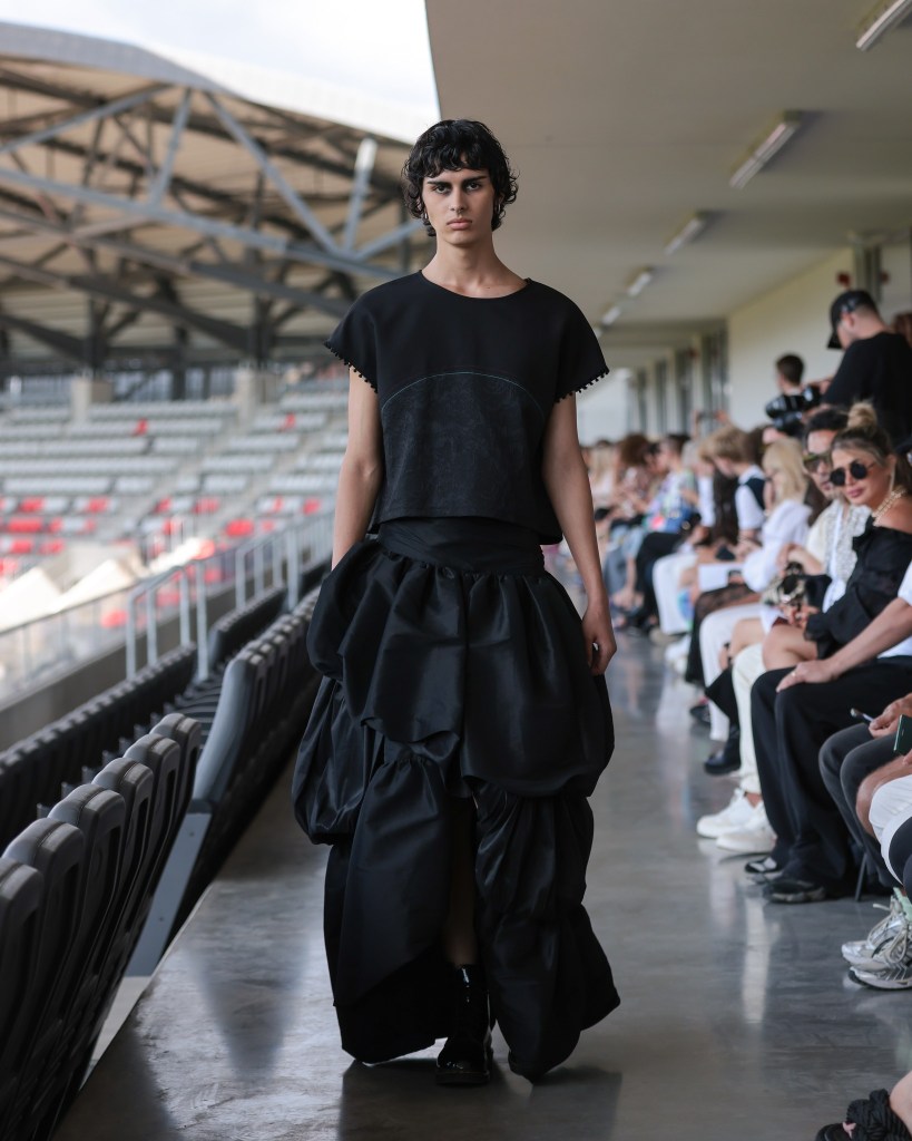 As the sun ascended, the first showcasing took place in the basement of Morii Boromir, featuring Natalie Soto’s enchanting collection, “Paper Dolls”. A meditation on healing and reinvention, Soto transformed fragments of memory into romantic silhouettes infused with an edgy flair. The collection featured reimagined shirts, cargo pants, bubble skirts, and babydoll dresses in a captivating palette of black, pink, and yellow. Employing repurposed textiles such as jersey, lace, organza, and hand-woven fabrics, each piece was adorned with hand-stitched details, pearls, bows, and woven bags—demonstrating that beauty can indeed emerge from remnants of the past.