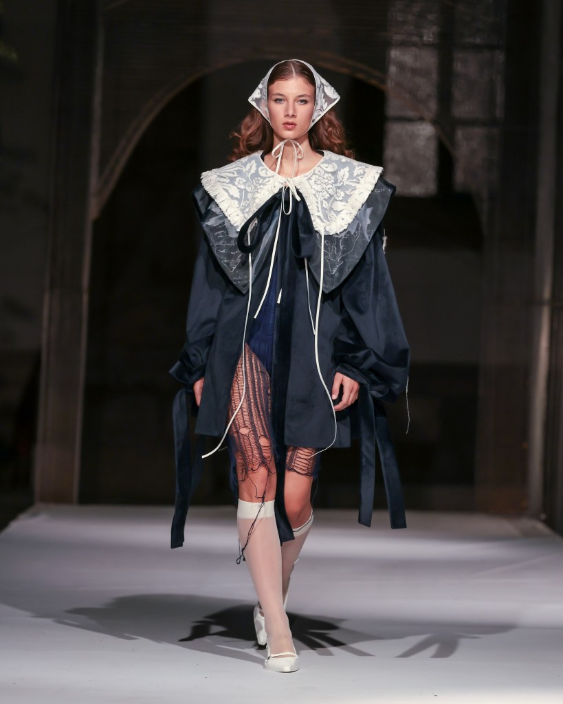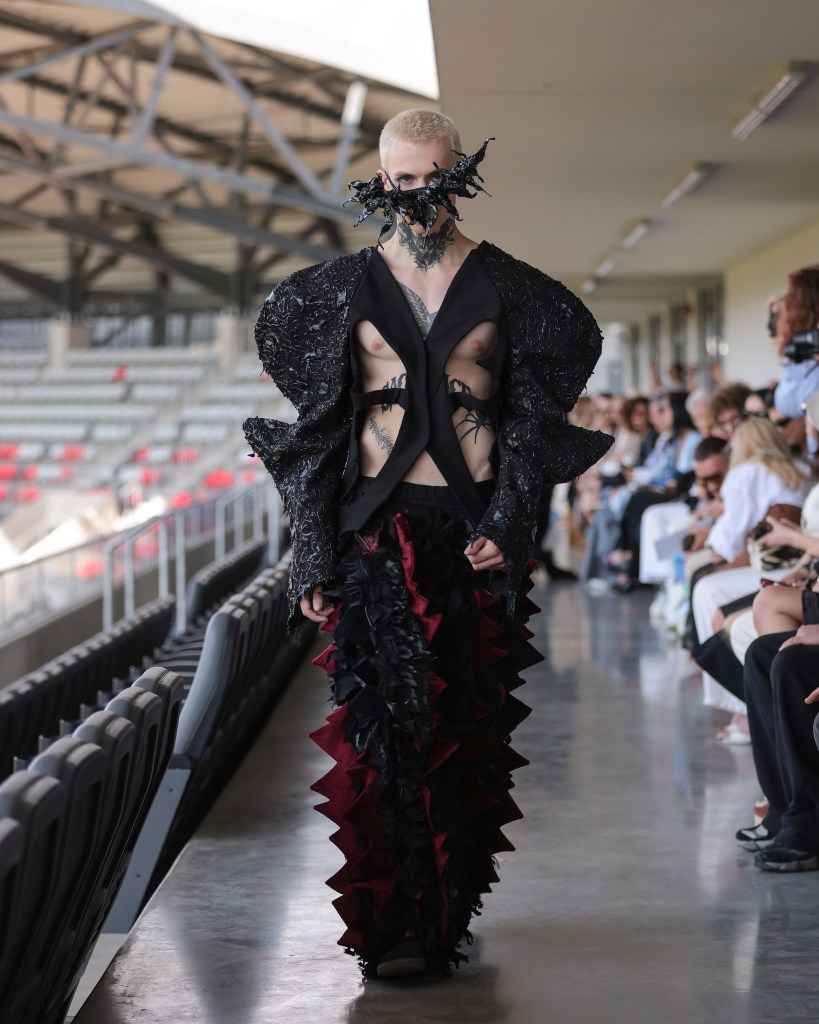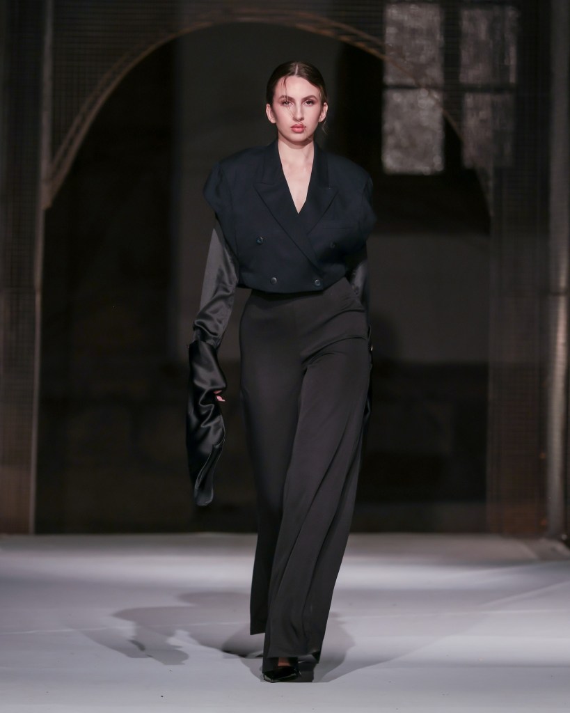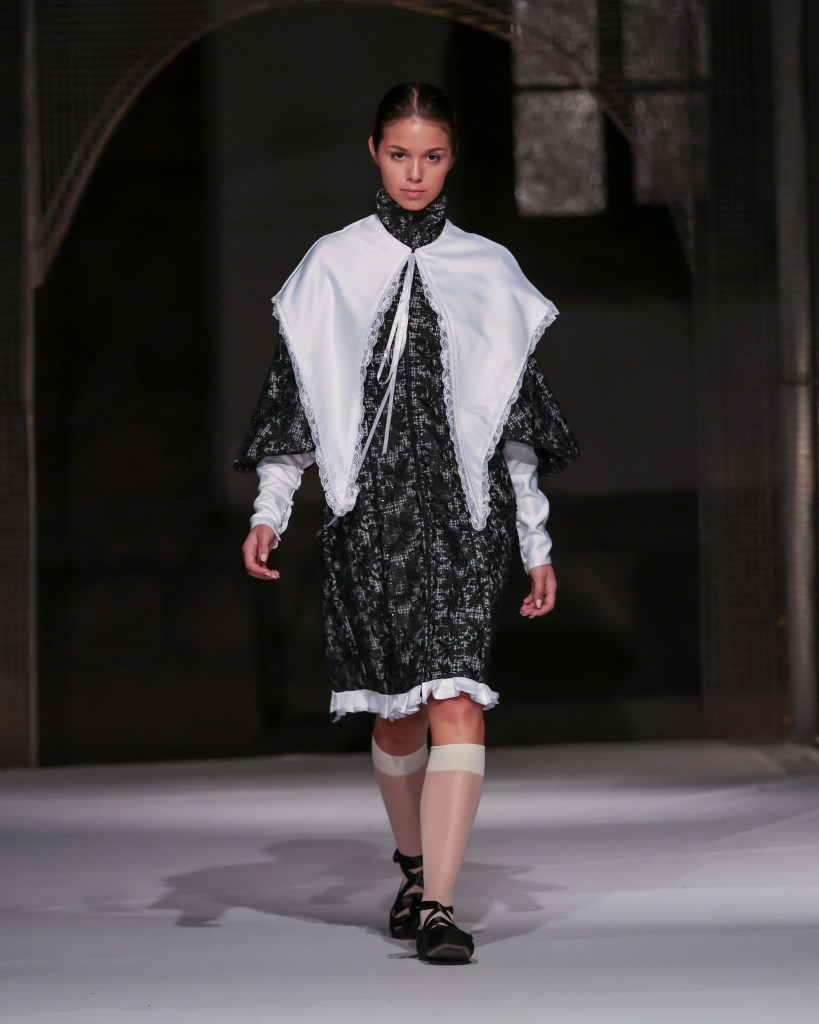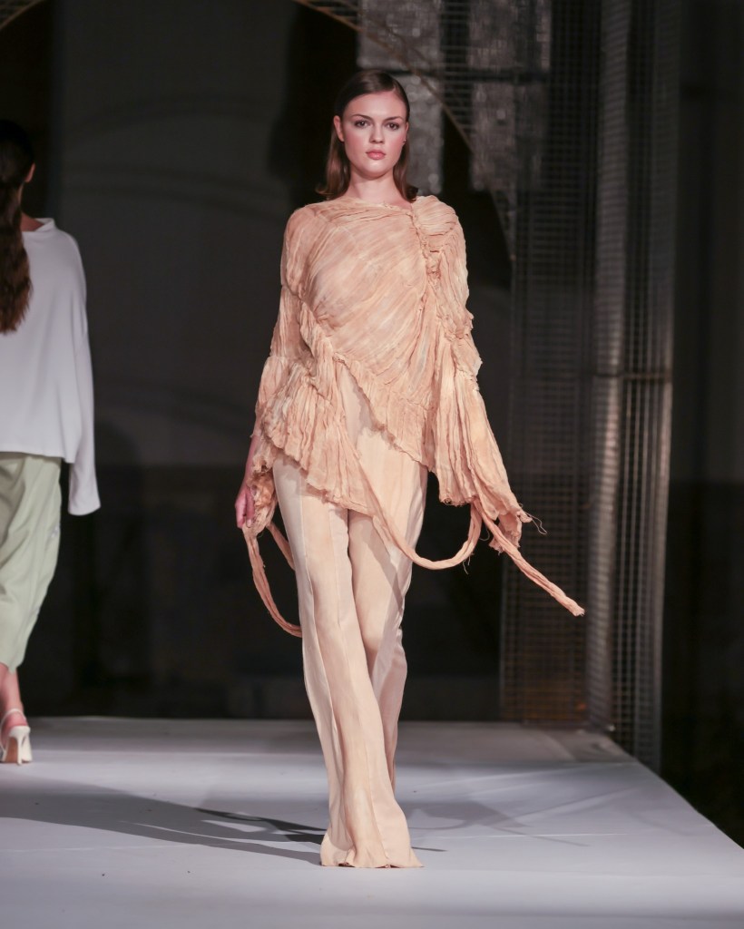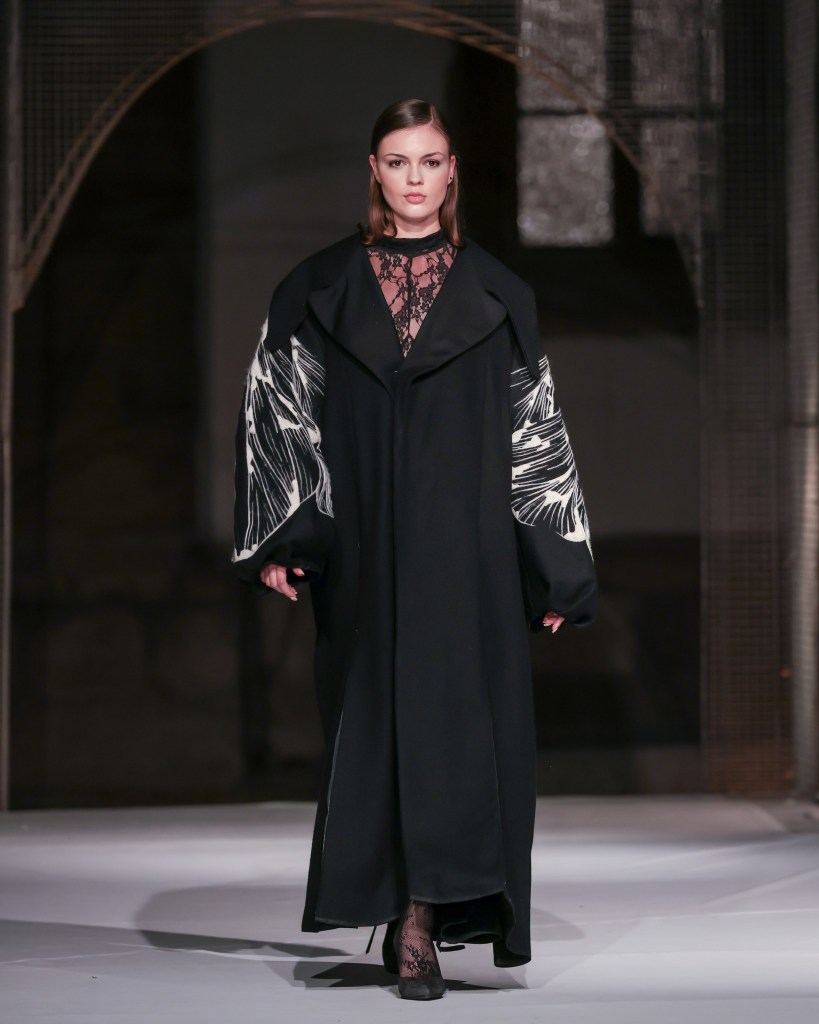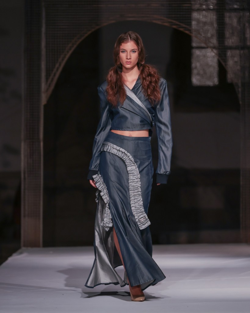 Not to be outdone, designers from the National University of Arts “George Enescu” in Iași—Alexandra Țigăeru, Delia Briceag, and Teodora Gaciu —constructed a visual journey where past, symbolism, and future coexisted in contrasting harmony. Their collection seamlessly blended reinterpreted tradition, spiritual symbolism, and deconstructive sustainability, showcasing the rich tapestry of influences that characterize contemporary fashion.