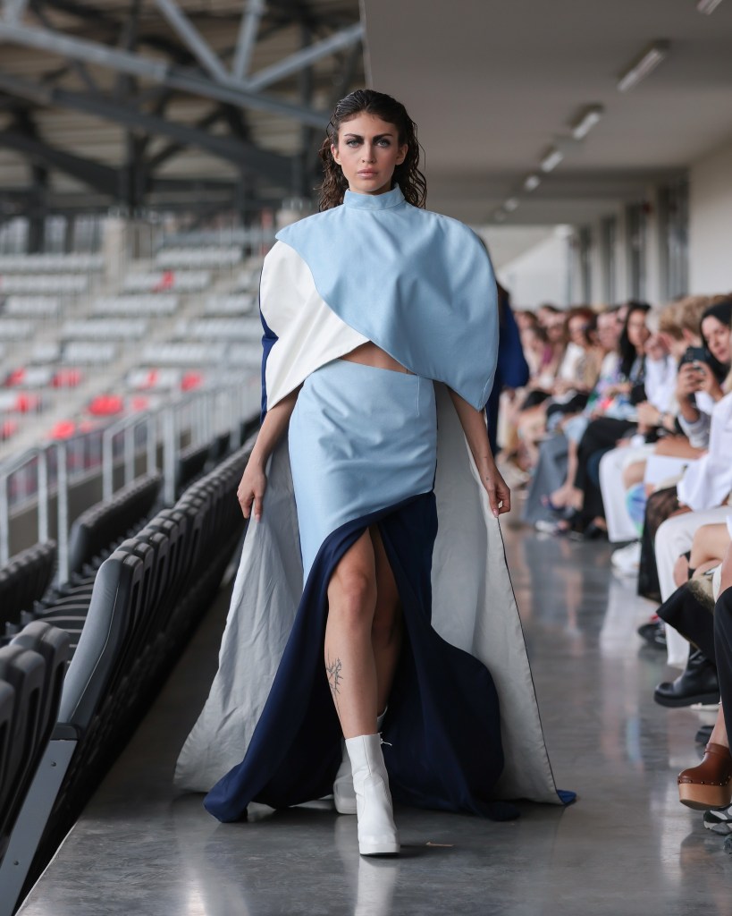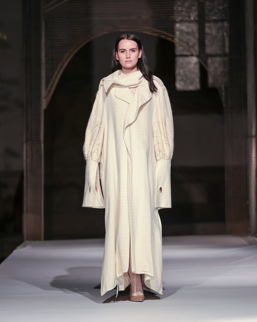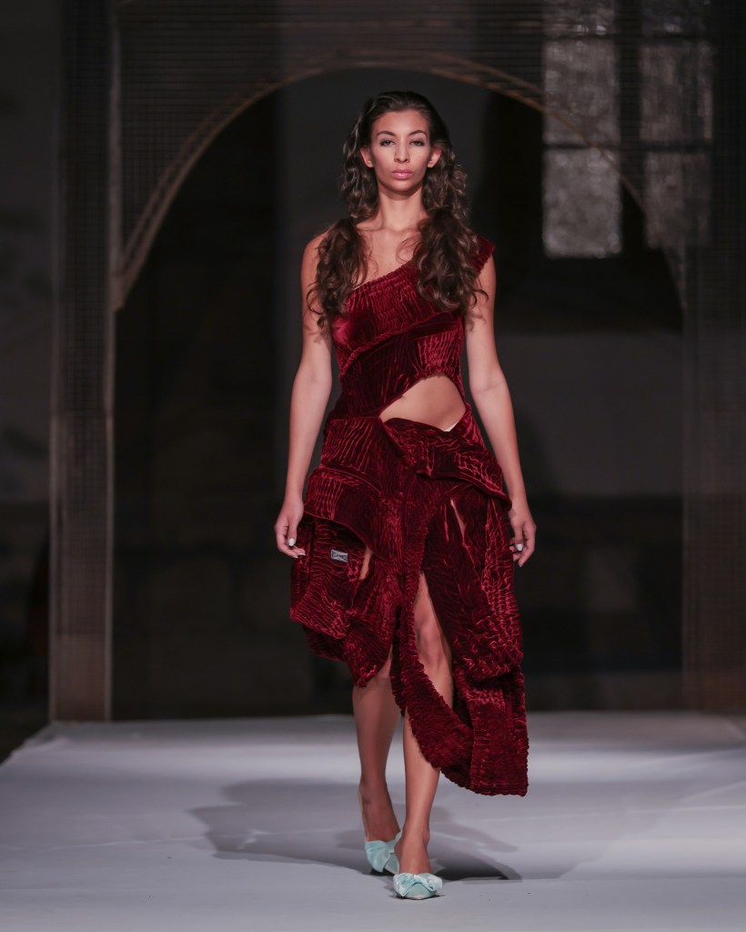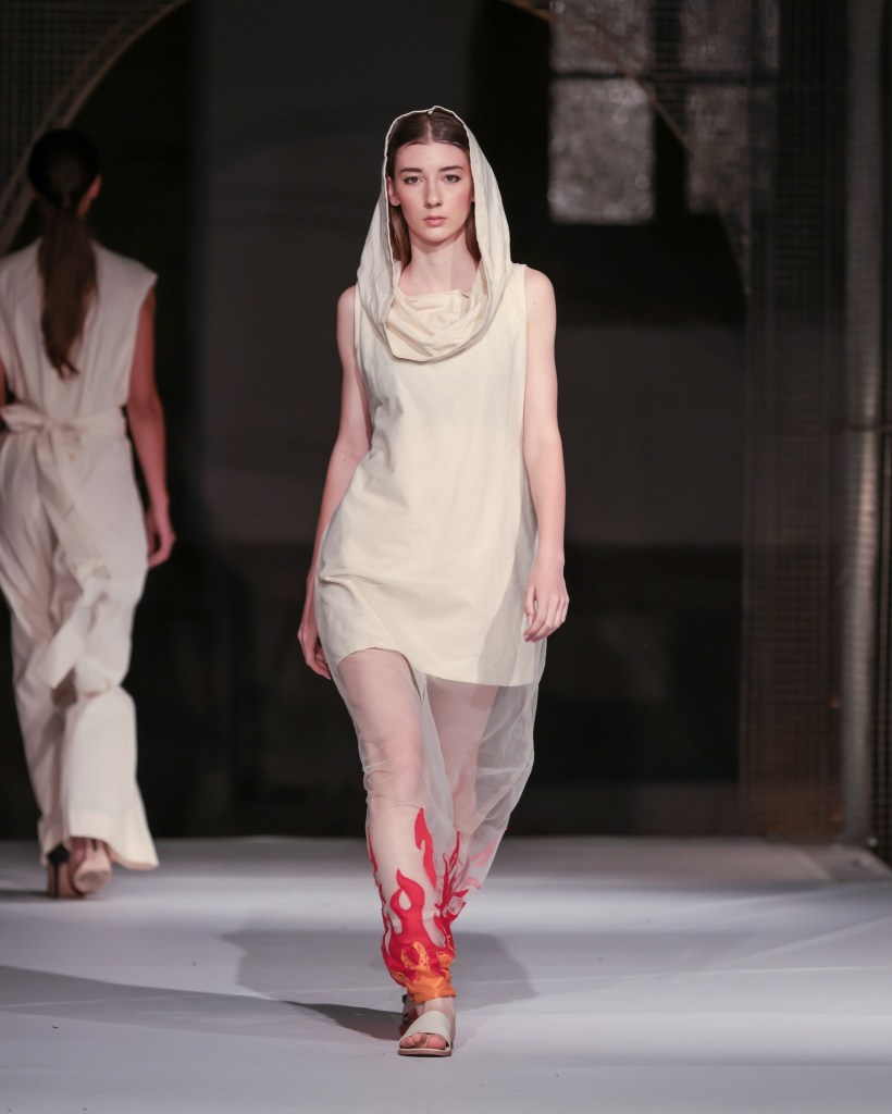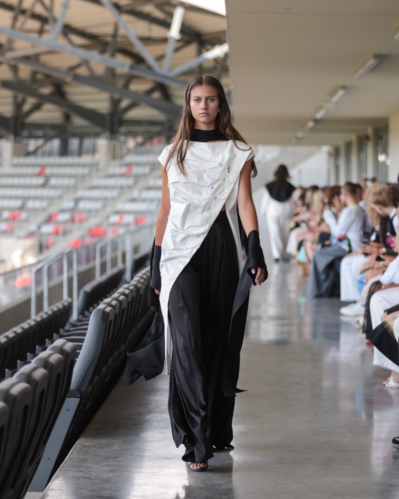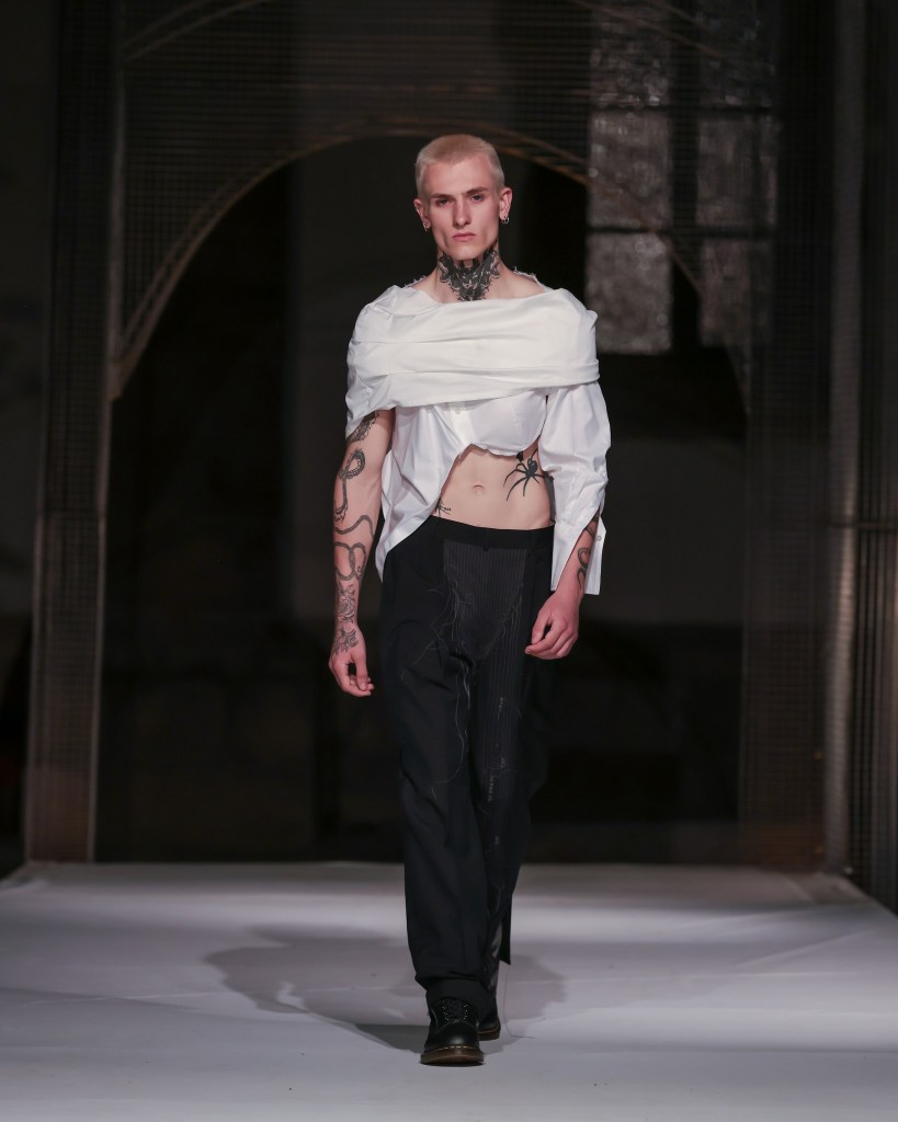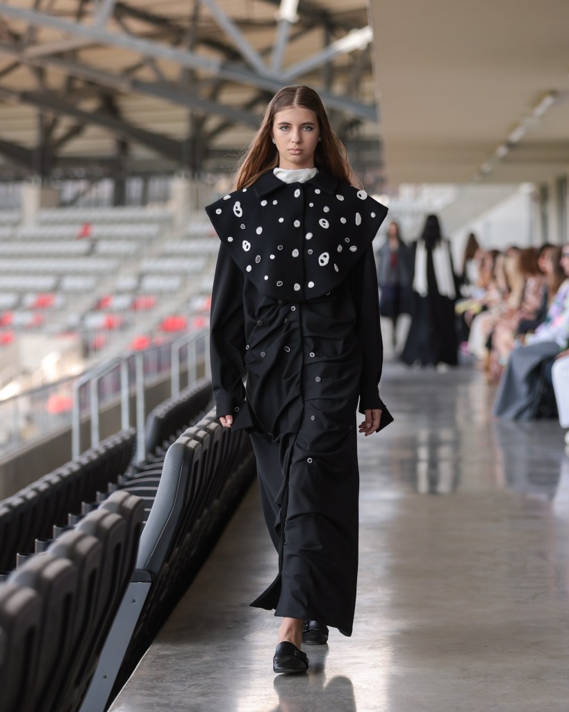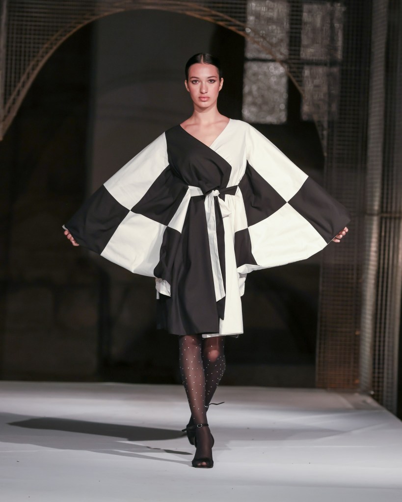 Not to be outdone, designers from the National University of Arts “George Enescu” in Iași—Alexandra Țigăeru, Delia Briceag, and Teodora Gaciu —constructed a visual journey where past, symbolism, and future coexisted in contrasting harmony. Their collection seamlessly blended reinterpreted tradition, spiritual symbolism, and deconstructive sustainability, showcasing the rich tapestry of influences that characterize contemporary fashion.