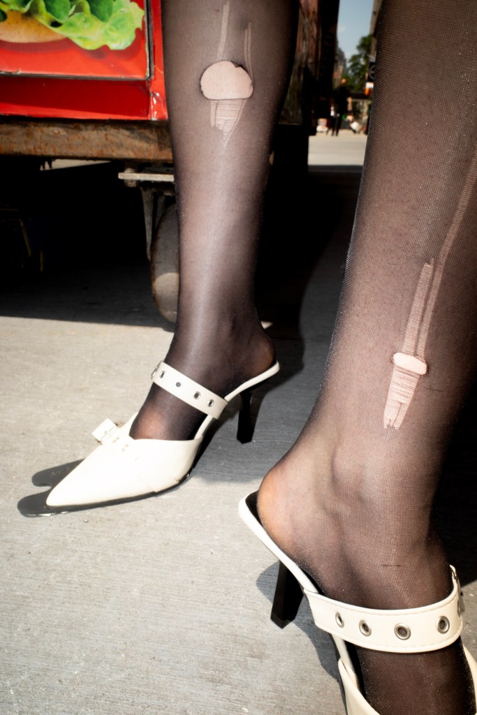 Slogan t-shirt + Footless mesh knee-high socks + Black pointy heels, stylist’s own