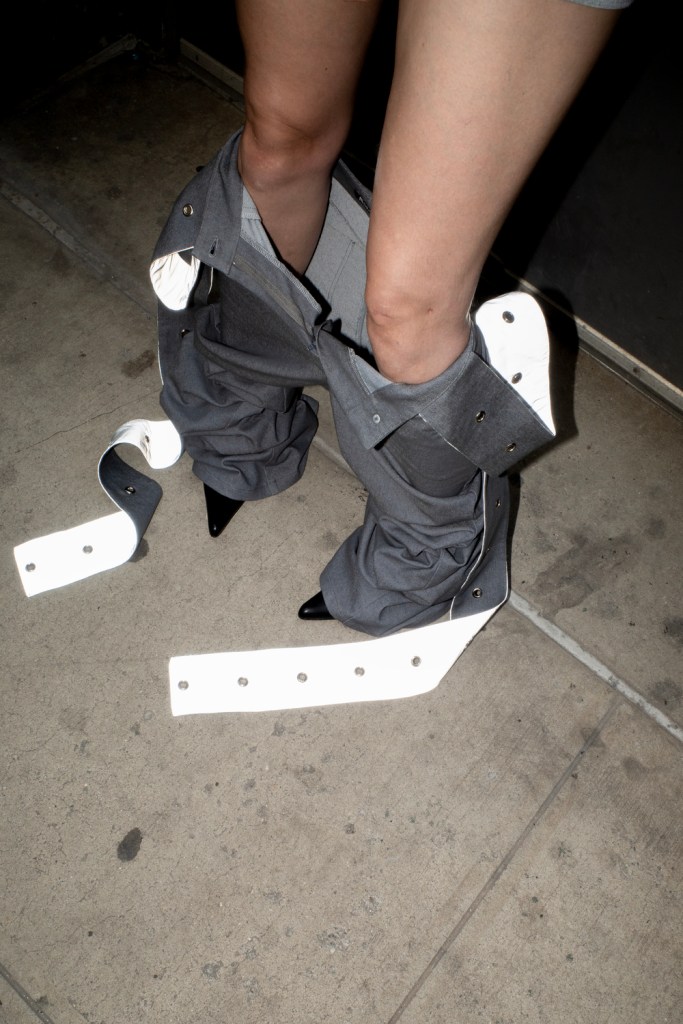 White trikini body, Evropa – Black sartorial double breasted blazer, AENDOR STUDIO – Black tights with holes, stylist’s own