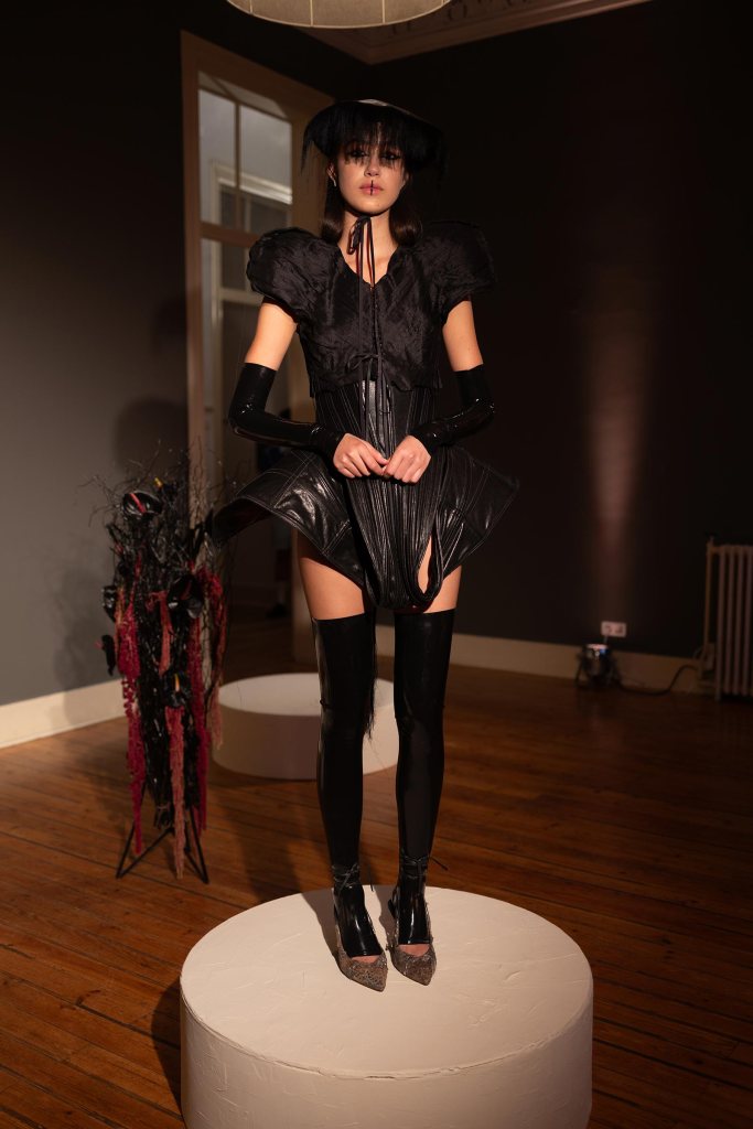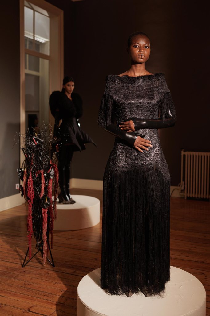 The collection features a monochromatic palette dominated by black — a deliberate choice, rich in symbolic and emotional weight. Here, black does not represent absence but rather the concentration of memories, struggles, and silent resistances. textiles manually constructed from yarns receive treatments that give them their own structure — firm without losing lightness, delicate yet with a strong presence. The silks, hand-draped and inspired by the voluminous skirts of traditional Portuguese attire, contrast with the firmness of leather, reflecting the constant tension between protection and exposure. Each piece is conceived as a body of memory — as if the garment itself holds lived stories and inherited silences. More than clothing, this collection is a declaration of resistance. It speaks of inter generational traumas, of freedom won through struggle, of a female body that resists imposed forms.