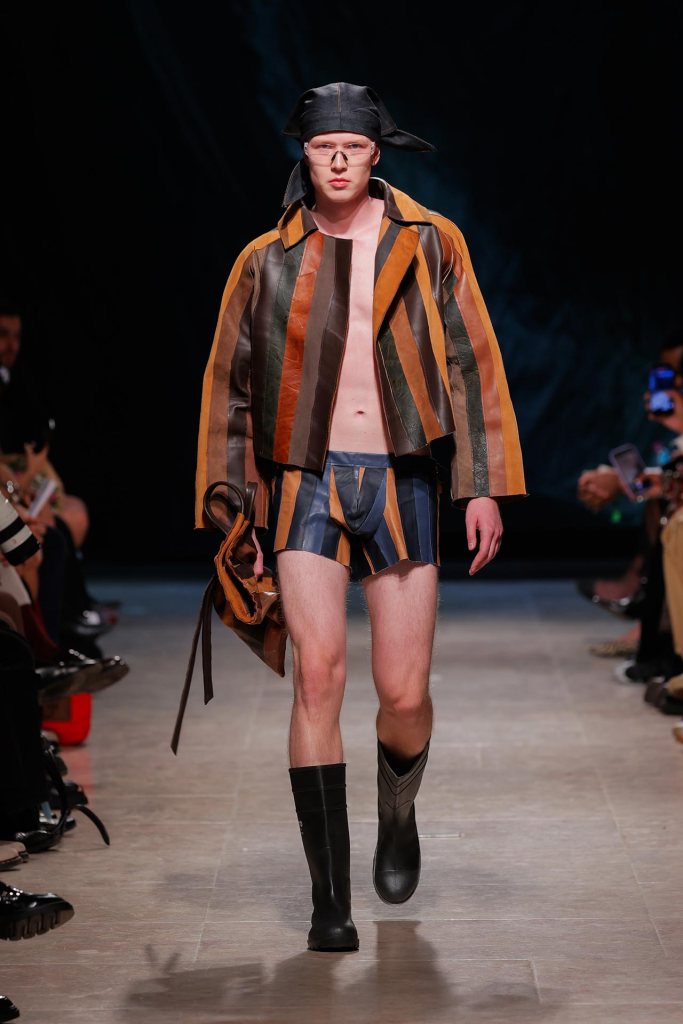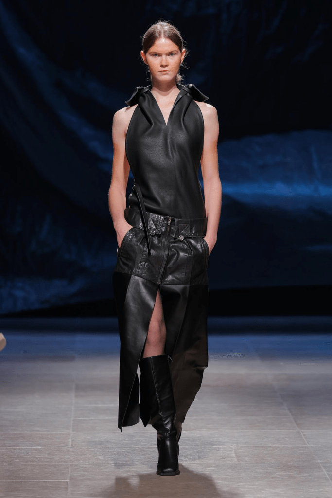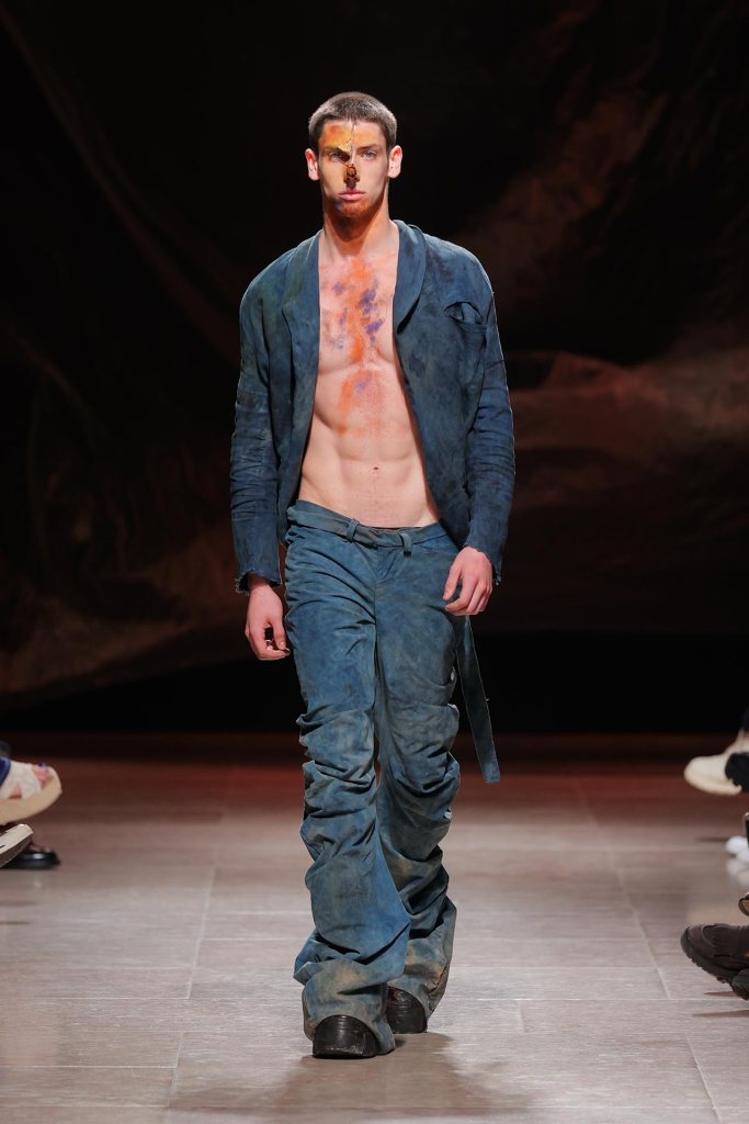 The 75 collection was born from an urgency: to liberate the male body from the visual neutrality that confines it. Eliminating trousers was the first step. From leather, denim, and lace knit, Ariana Orrico created a body that wears doubt rather than tradition. The path was to (re)imagine, to question, to provoke, and to open space for the body to experience new ways of existing. The final result is a series of looks that carry the weight of tools for self-discovery. This capsule is materialized in cotton fabrics sourced from textile waste and in genuine leather, purchased as offcuts and transformed into patchwork, making use of every fragment to its fullest.