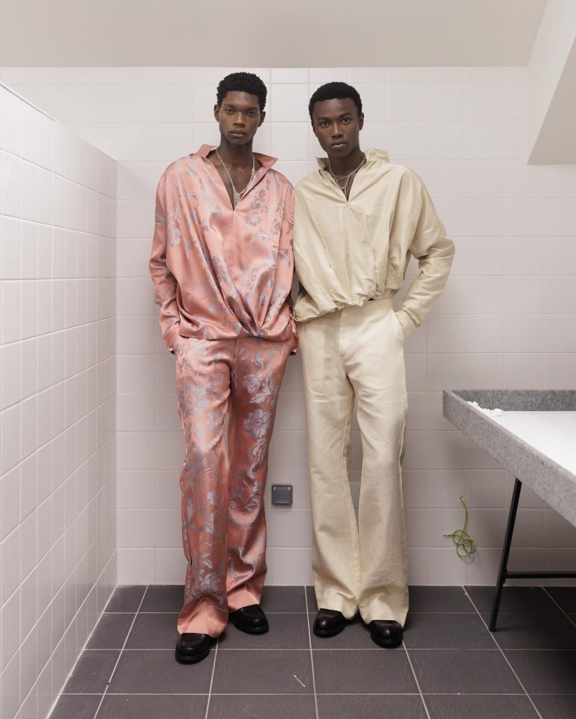 PERLIMPIMPIM sets Gabriel Silva Barros’s design language. PERLIMPIMPIM is a world of constant fluidity between reality and fantasy. Delfim Maya and Francisco Simões guide this conversation, Maya’s construction techniques and Simões’s soft eroticism act as dual reference points, giving rise to the PERLIMPIMPIM look. Soft Eroticism and technical identity. The seductive silhouettes were achieved by using contrasting techniques to reflect this dialogue. Lightweight fabrics are merged with heavier ones, causing intentional tension and movement. Duality in the colour palette, pink and blue, black and white, also express this. The Designer is manifesting a space for creative expression, and inviting the wearer to the conversation. Pulling from Portuguese history, Gabriel Silva Barros designed a wardrobe that merges wearability with theatrical elegance. A “noman’s” space where contrasts can coexist. A collection of beauty, between theatrical drama and delicate intimacy.