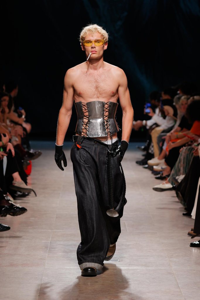 ELIO is the creative project of Élio Ramos, a Designer from the Algarve currently based in Lisbon. A graduate in Fashion Design from the Faculty of Architecture of the University of Lisbon, Élio Ramos has developed a critical and powerful design language that intersects body, memory, and identity. Through deconstruction and material exploration, he approaches fashion as a discourse, na attitude, and a tool of transformation, always rooted in values of sustainability, inclusion, and an irreverent irony that has become the signature of his work. Between skin and metal, LUBE emerges from the oily floors of workshops, where masculinity dresses in uniform and silence. But what if that body were exposed? What if the gaze turned? The collection stems from this unease. In a space where the sight of naked women in calendars has been normalized, LUBE responds by revealing the male body, vulnerable, tense, desirable. The material is raw, recycled, with inner tubes, metal, and cuts that disarm. The corset constricts, the clothes weighs, and discomfort becomes language. Here, absence reveals more than presence. LUBE does not soften the man, but tears apart the idea that he must remain hidden. It is between the mechanical and the intimate that the body relearns how to be seen. Without asking permission. Without disguise.