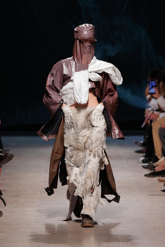 The collection ÚLTIMO EMPREGADO (The Last Worker) draws on the experiences and history of Xavier Silva’s family, marked by years of hard, undervalued work. Through this collection, the Designer seeks to transform feelings of weariness and invisibility into artistic and enriching creation. The collection incorporates uniforms once worn by Xavier Silva and his family, preserving stains, tears, and patches as testimonies of their “battle scars.” These elements, combined with repurposed work objects – such as worn gloves and used cloths – reinforce the connection to upcycling and the emotional memory embedded in clothing. From this process emerges a conscious fashion proposal that gives new life to what was once discarded, transforming stories of effort and resilience into unique pieces, full of authenticity and meaning.
