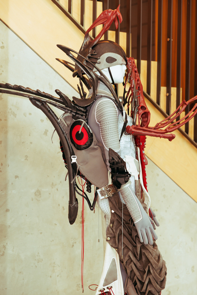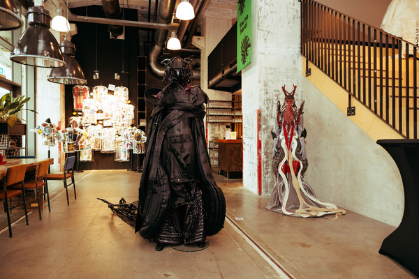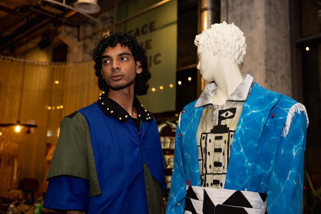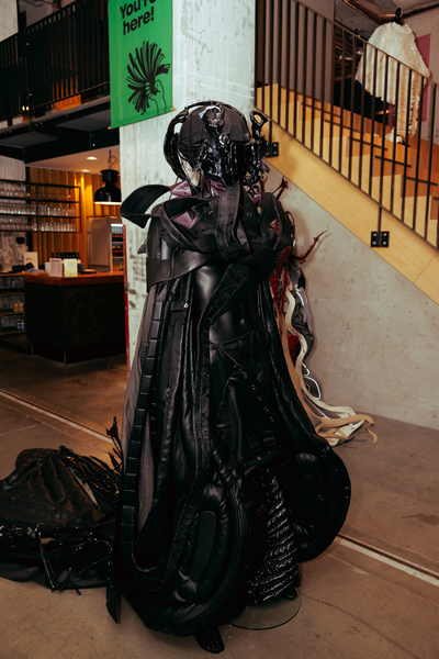 Jamie AirMountain presented ‘ALOHA Wijk aan Zee’, recycling beach materials—trash, wood, wetsuits, denim—into layered garments celebrating coastal life while addressing environmental waste. Maide explored Dutch-Turkish heritage through ‘Gurbet’, translating traditional basket weaving learned from Turkish artisans into contemporary minimalist garments. Zhenyi Zhou reimagined Chinese folklore through “Gu Spirit – Post-Human Witchcraft”, creating sculptural garments merging 3D-printed bones, silicone, and reclaimed textiles. Karolina Wójtowicz created ‘POLISH YOUR GEAR’ in latex and motorcycle gear, exploring immigrant identity through a character caught between Polish heritage and contemporary life. Claire Sillekens presented ‘De zon schijnt precies op je gezicht’, interactive costumes for four characters whose missions provoke conversations about societal impact through absurdity. Paco Teepe showcased ‘Monuments T-Shirts’, a Wearable Visual Archive printing childhood memories onto T-shirts, making the past literally wearable. Jessie Romkens presented ‘LOUD & LIMITLESS’, stage wear translating music’s energy into bold garments through spray paint, patchwork, and embroidery. Babs Groote Schaarsberg displayed ‘Een Ode Aan’, wearable sculptures honoring traditional Salland attire with mechanical elements that invite curiosity. Larissa de Jager presented ‘Redress Is Rising’, upcycled costumes with distorted volumes addressing body positivity and retail sizing limitations.